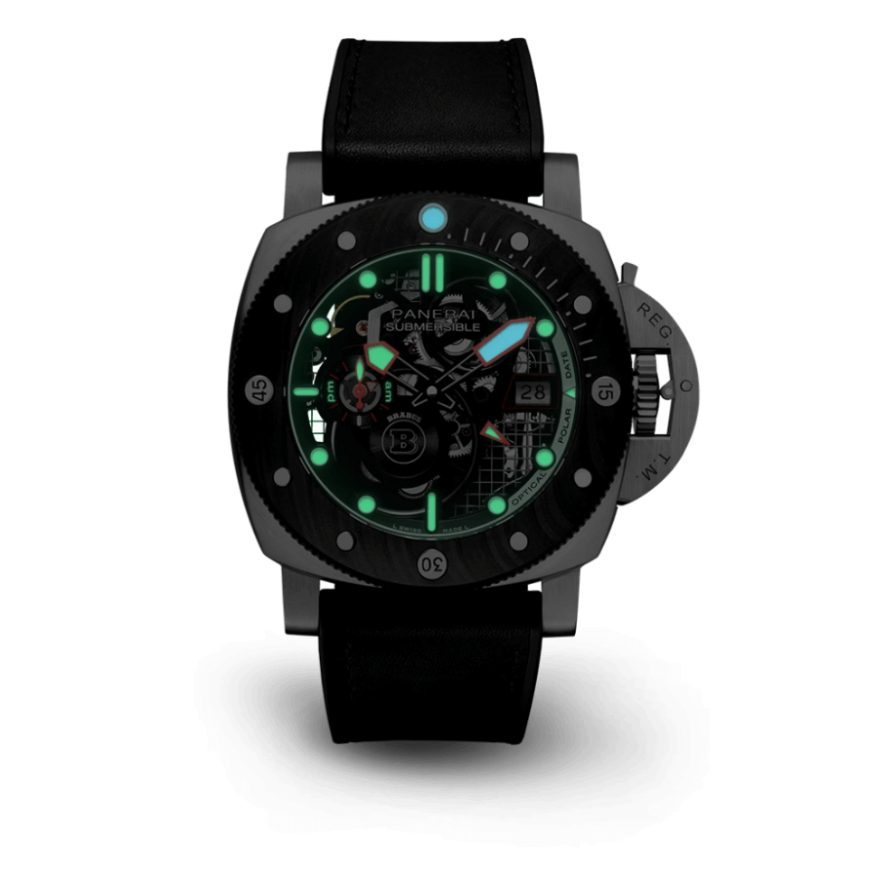 In addition to its basic timekeeping functions, the Submersible S Titanio indicates the date, power reserve, small seconds, second time zone, and world time. The entire collection of complications runs on Panerai’s in-house P.4001/S caliber. The 31-jewel self-winding movement packs two barrels for a robust 3-day power reserve. Of course, the BRABUS “B” branding is likewise on full display.