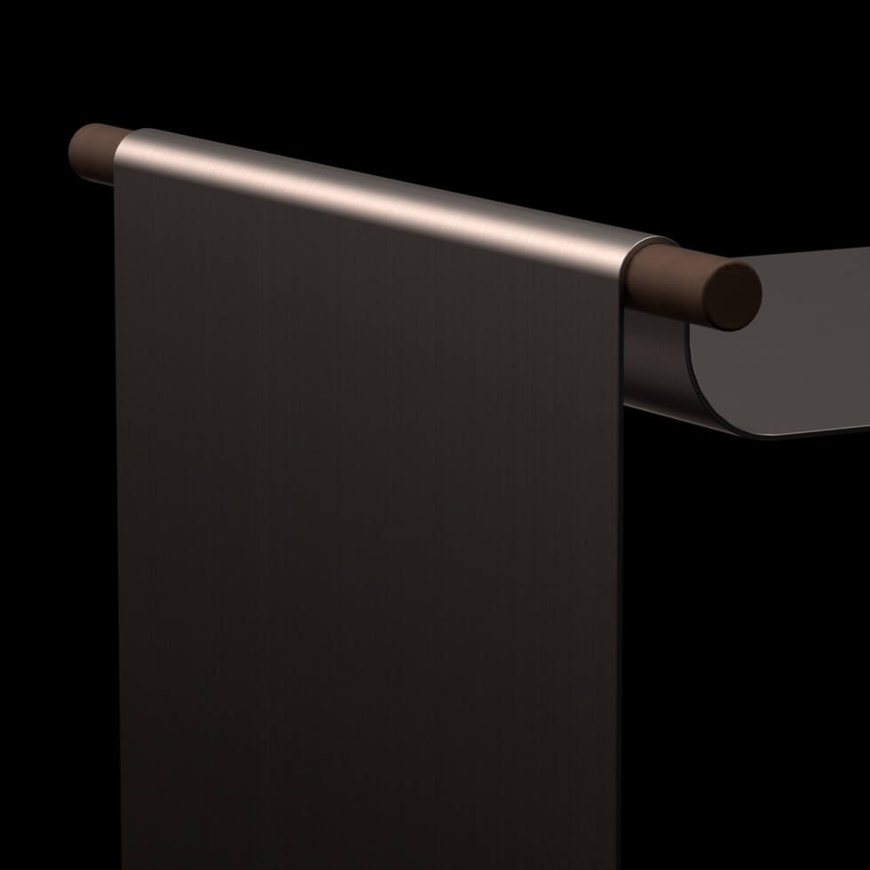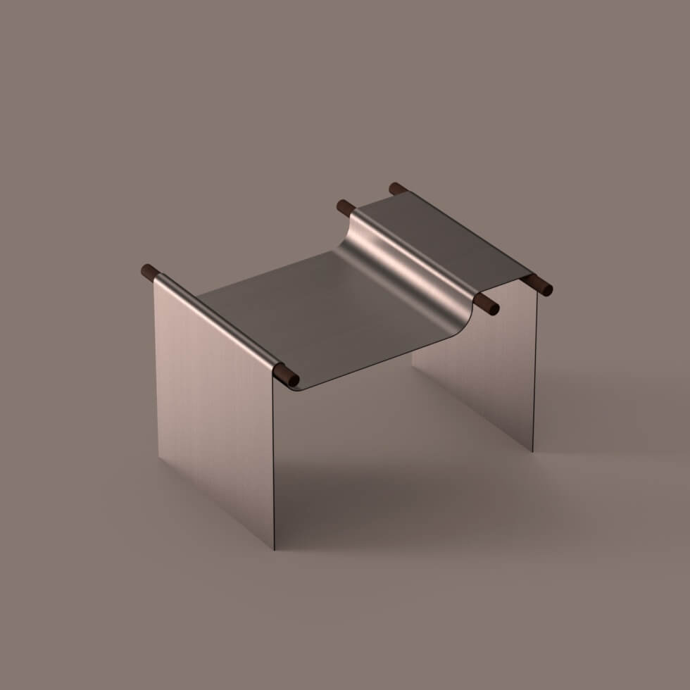 But this is its design. This furniture comprises a single sheet of steel carefully bent with specific folds draped over wooden cylinders to mimic the fluidity of draped fabric. These wooden elements seem to lift the metal, painting a picture of a scroll being unfurled.