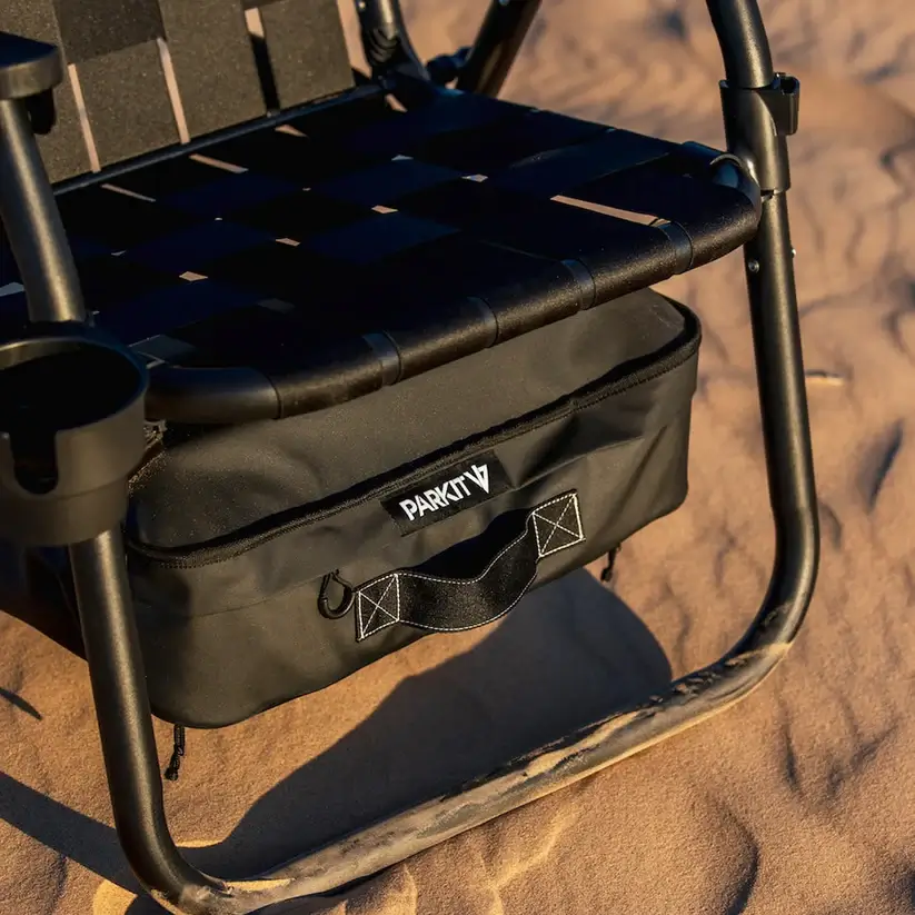 The ParkIt Voyager is a cooler-chair combo built to withstand the outdoors but designed to feel like lounging at home. It offers a comfortable sitting position 16″ off the ground without sacrificing quality. It’s aircraft-grade aluminum foundation ensures strength, durability, and resilience, while the soft woven polyester webbing on the seat and backrest retains its strength so its feels “like new” every use.