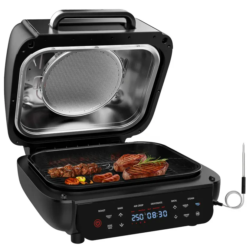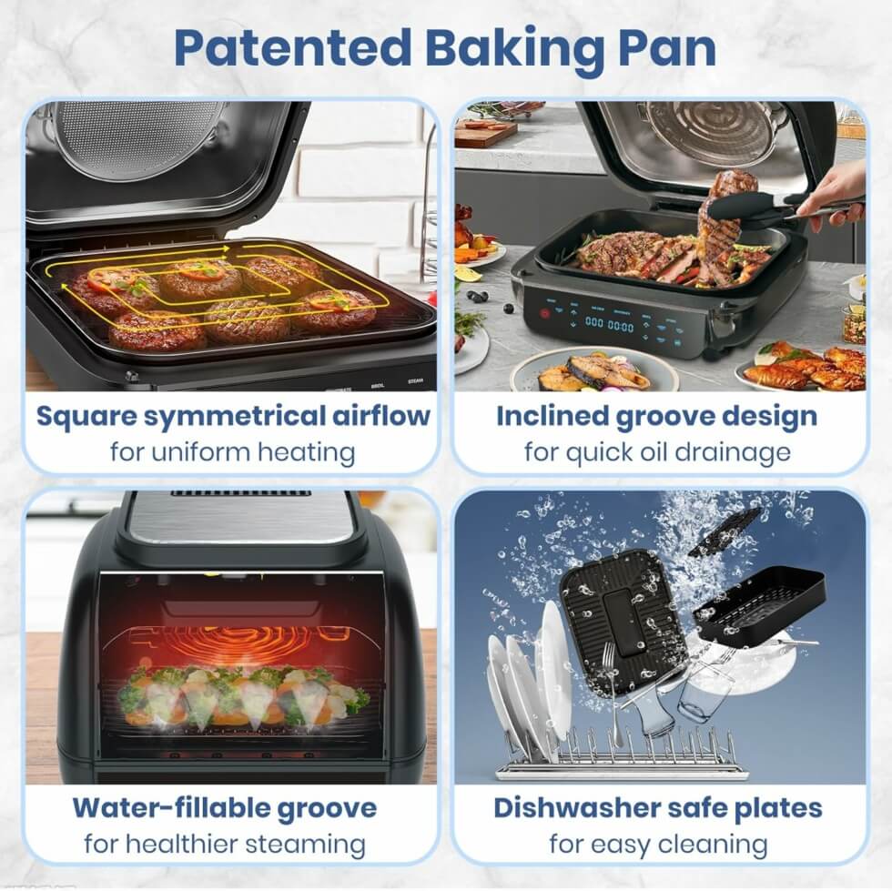 This 1800W indoor grill serves as a baking oven, a smokeless grill, air fryer, frying pan, steak machine, dehydrator, toaster, and more. The baking pan has a 6QT capacity and can cook up to six steaks, 24 hot dogs, other main and side dishes simultaneously. Meanwhile, the air fryer grill combo also includes an air fry basket for fries.