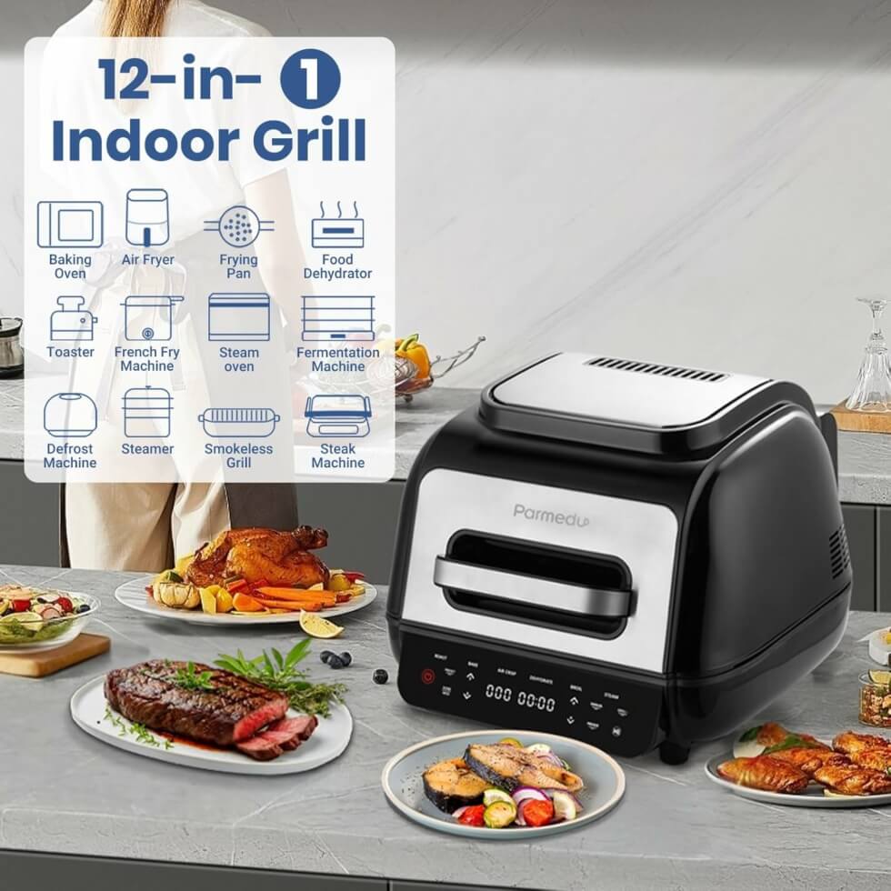 When it comes to kitchen appliances, you’d want to invest in something durable and packs a lot of punch. Something like the Parmedu Air Fryer Indoor Grill, which boasts 12 amazing functions in a compact yet spacious design built to serve a large family.