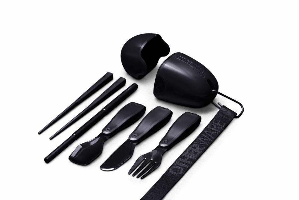 The set comes with a spoon, knife, and fork that fold to store using a hinge, and chopsticks that come in two pieces and screw together. There is also a straw. All are made with “a sleek and elegant tone-on-tone treatment.” One of the materials used is recycled CDs, as such the set is said to be “made from music.” Other materials used include handles from recycled food packaging and tips of anodized titanium coated steel.