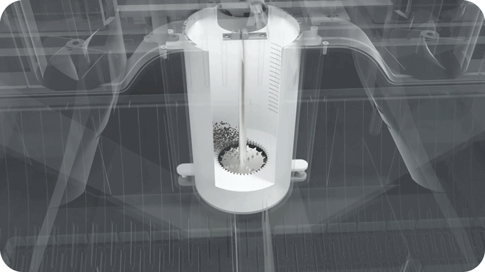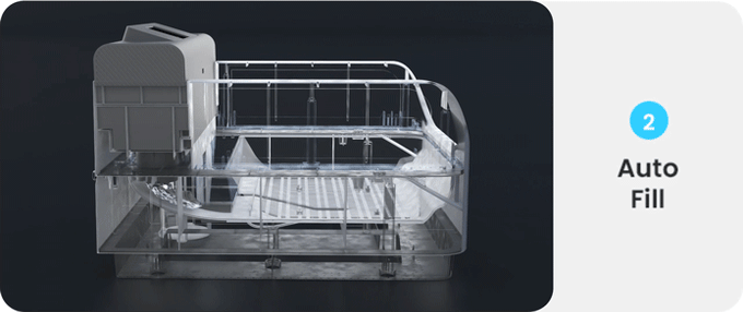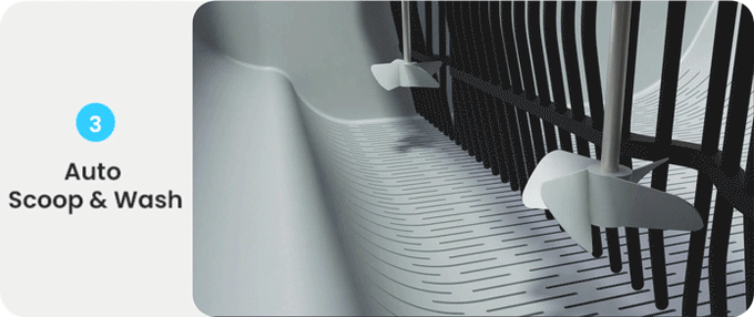 The Petalas Cat Litter Box fills the box with clean water, while a comb-shaped scoop pushes waste along a U-shaped track. A spiral agitator stirs the water to efficiently push waste into a separate crushing chamber. Waste is thoroughly pulverized inside the chamber and then flushed out along with wastewater through a dedicated drainage system.