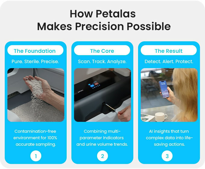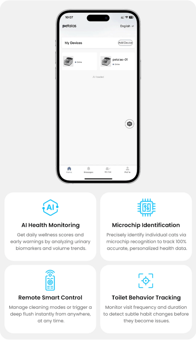 Moreover, Petalas monitors your cat’s health through analysis of collected uncontaminated urine. It distinguishes each pet for precise, reliable data gathering. A companion app provides easy-to-read wellness insights, customizations, and smart controls.