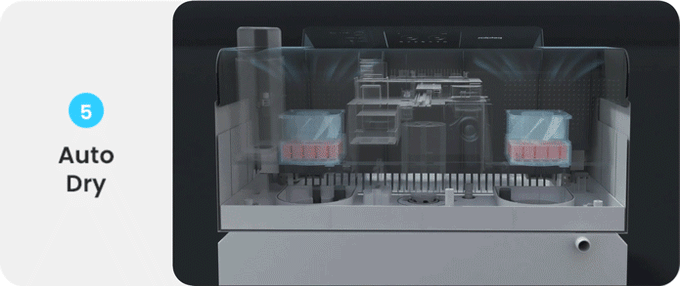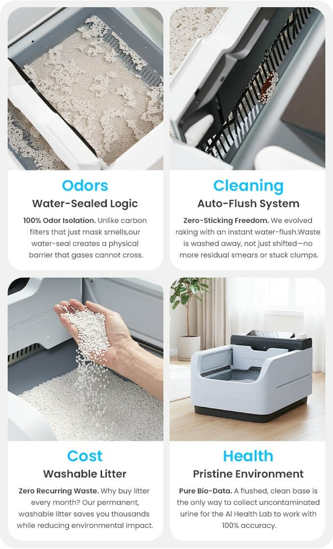 The entire cleaning process happens within a sealed water environment. This means there is no dust, residue, or lingering odor. A built-in hot-air drying system removes residual moisture and inhibits bacterial growth, keeping the litter area dry, hygienic, and ready for the next use.