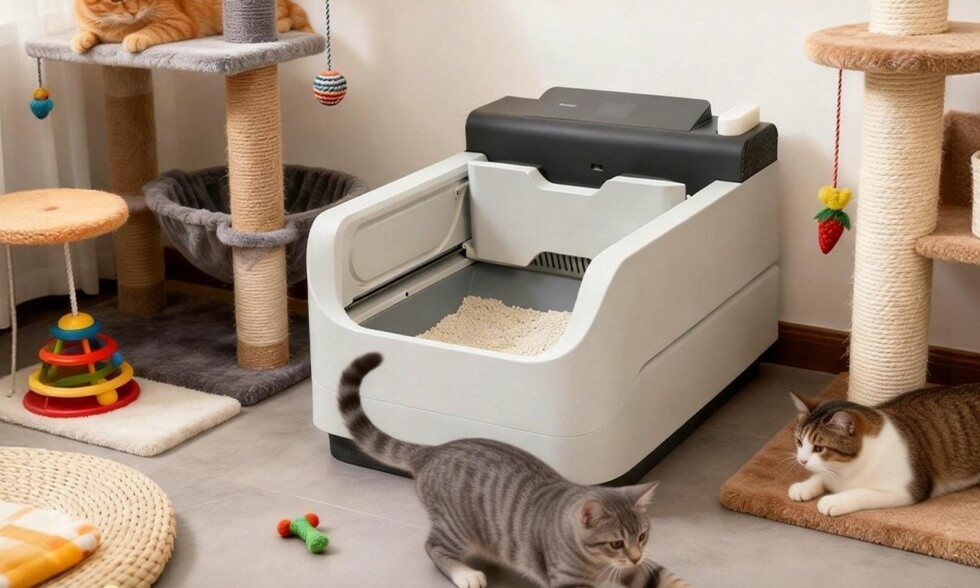 This smart device uses the physics of water, combined with AI-driven intelligence, to create a self-washing and sanitizing system. It features high-precision sensors that automatically detects your cat’s activity and initiates full-scale water cleaning and flushing.