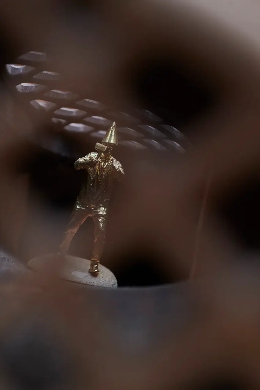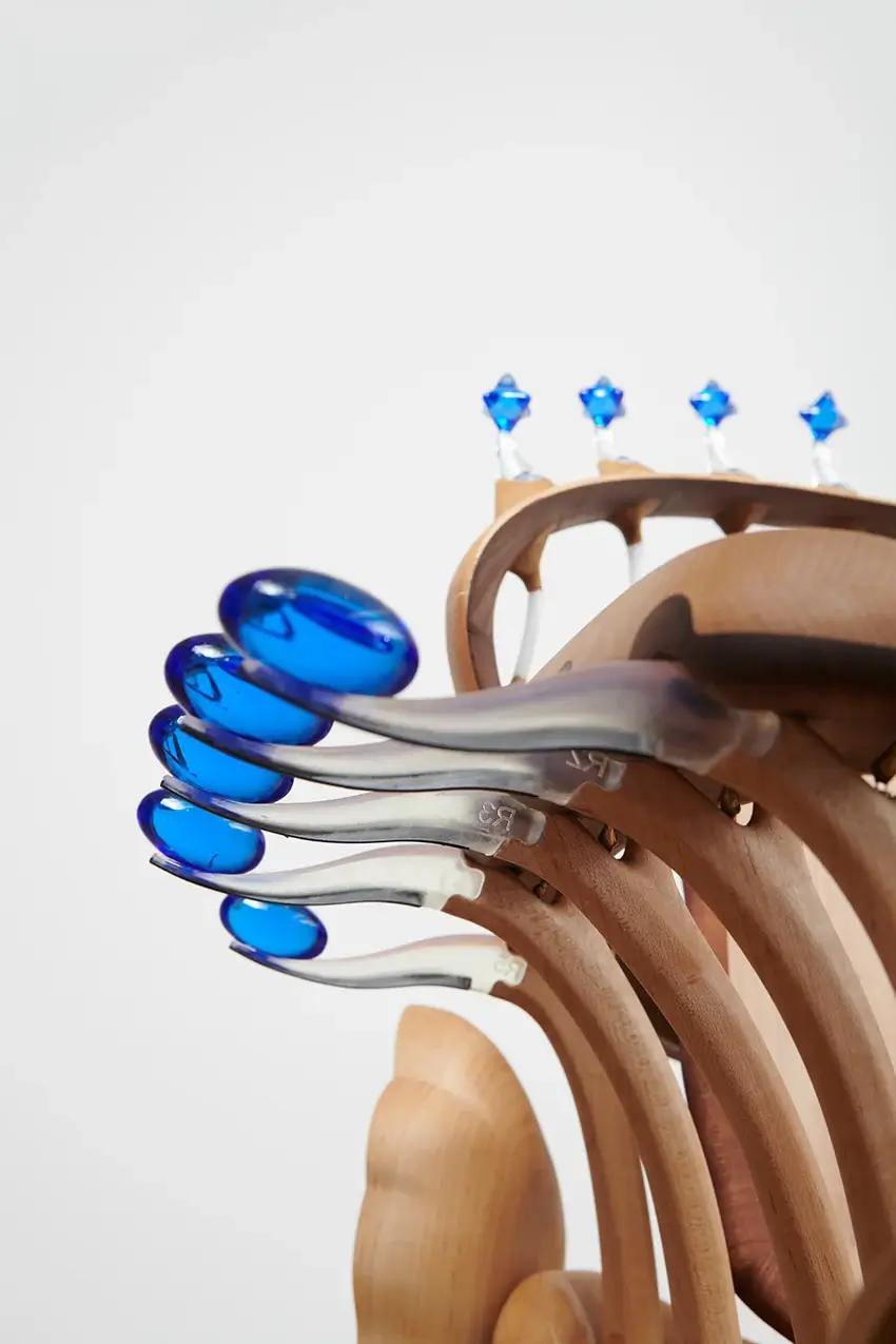 Tiny brass birds are perched silently yet shining against the wooden structure. Also, hidden inside the spine of the chair is a brass fairy maker. Sim’s COSMOS chair also includes a hand-carved sunflower and a halo around the sun that holds an array of stars digitally sculpted in 3D and then cast in cobalt blue glass. The brightness of the blue color creates a striking contrast against the natural wood backdrop.