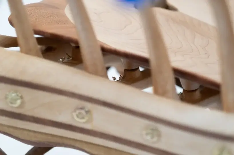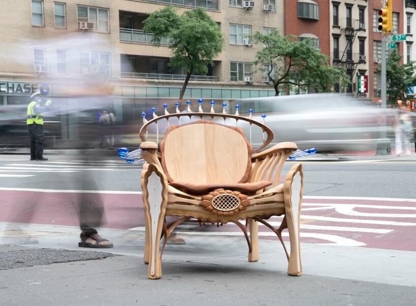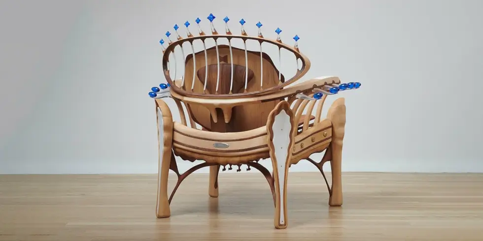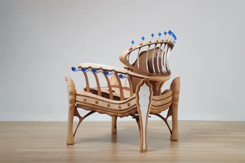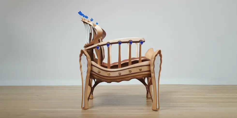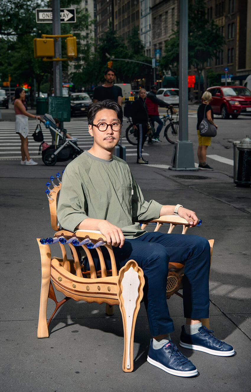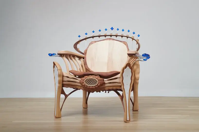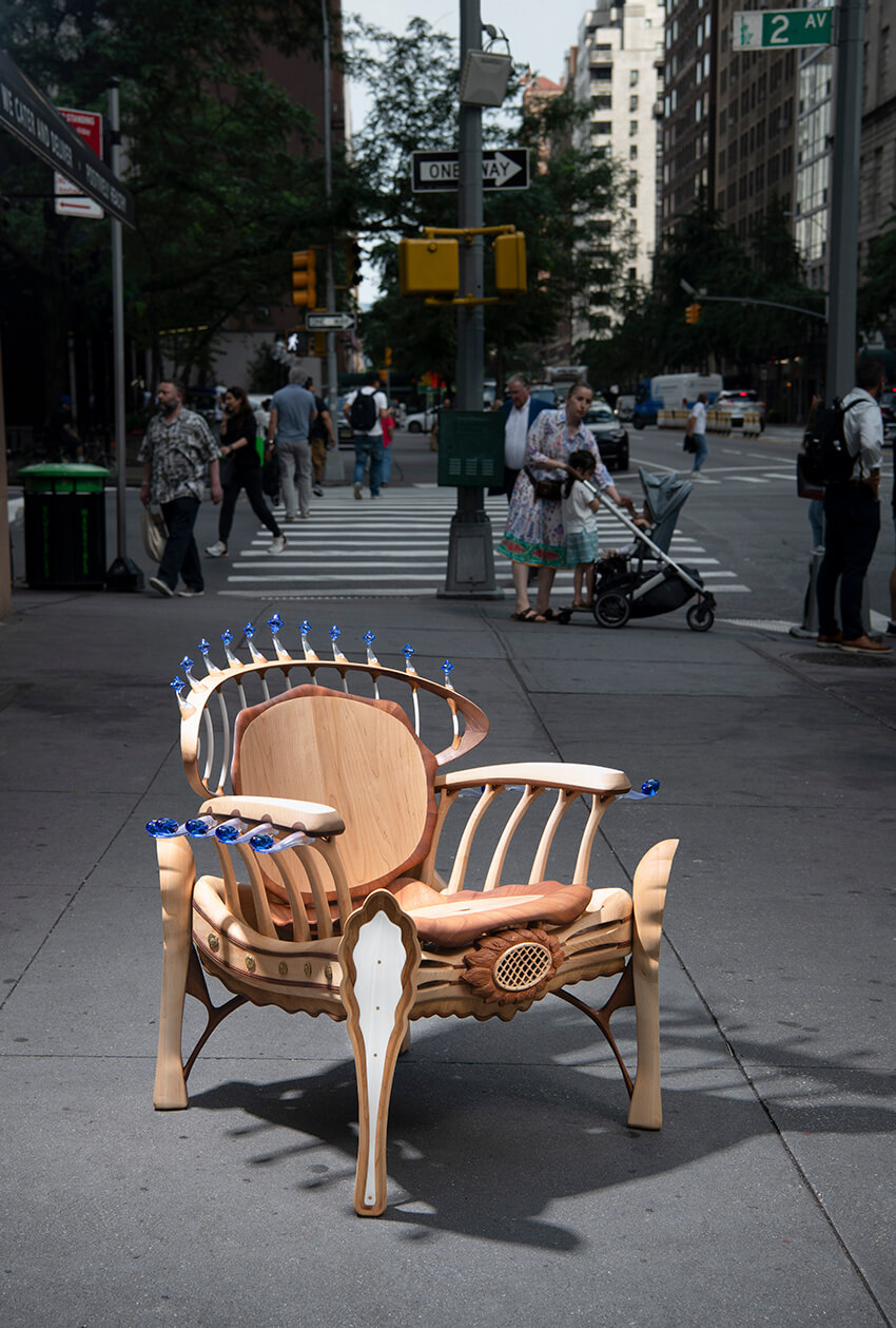 Meanwhile, alongside these non-human elements, the only human presence is the chair itself, as it shall seat a person and also represents the hand that crafted the meticulous design. Sim painstakingly expressed his creation in intricate curves, color, materials, and grain to create a piece of furniture that entices the imagination.