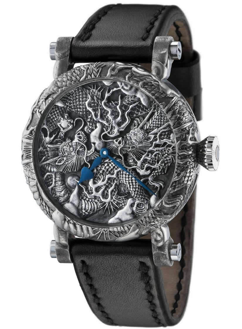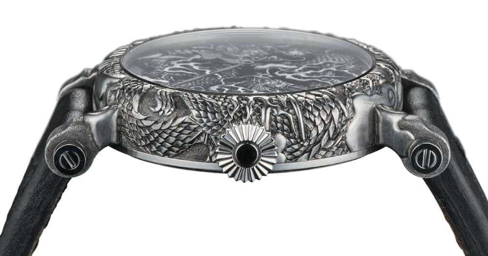 The extreme complexity of the design was given by the fact that not one, but two highly ornate dragons had to be fitted onto the very limited space of one wristwatch. The Peter Speake-Marin in-house SM2 movement was also engraved, while the presentation case’s leather lining was masterfully embossed for a beautiful, unitary effect.