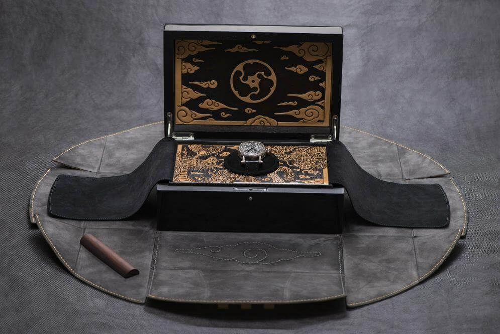 The intricate dragon engraving which starts from the dial, then spreads onto the white gold case, and finally continues onto the presentation box evokes a 1.883-suare-foot paining on the temple’s ceiling. Artist Koizumi Junsaku painted the expansive work of art in 2002 to commemorate the temple’s 800th anniversary.