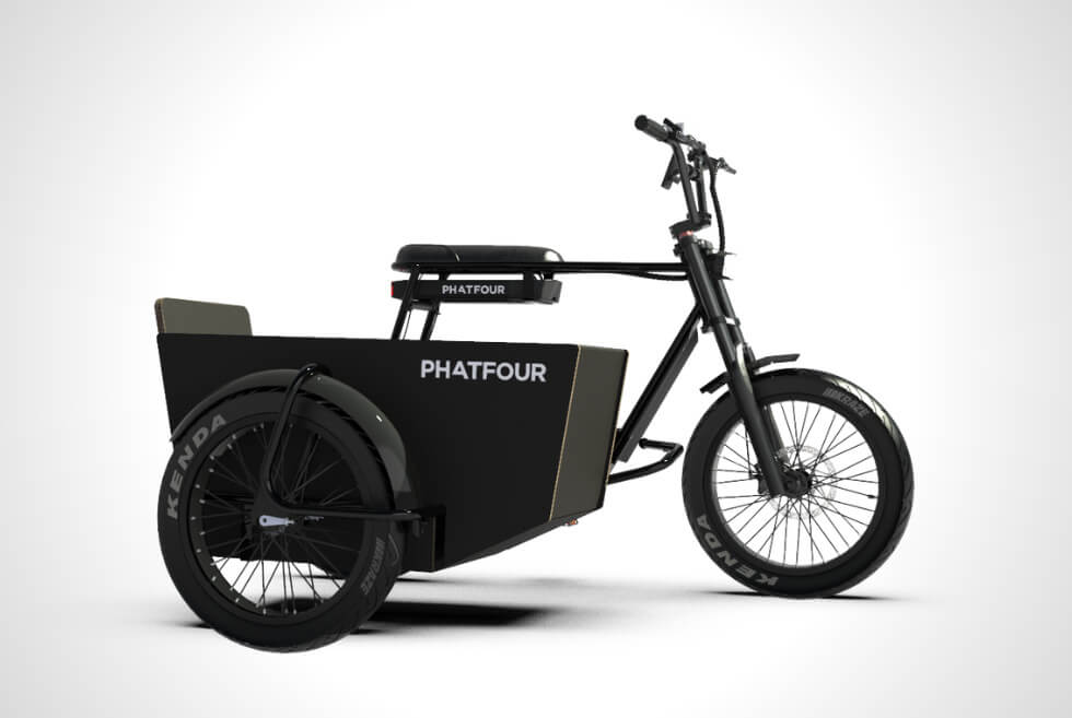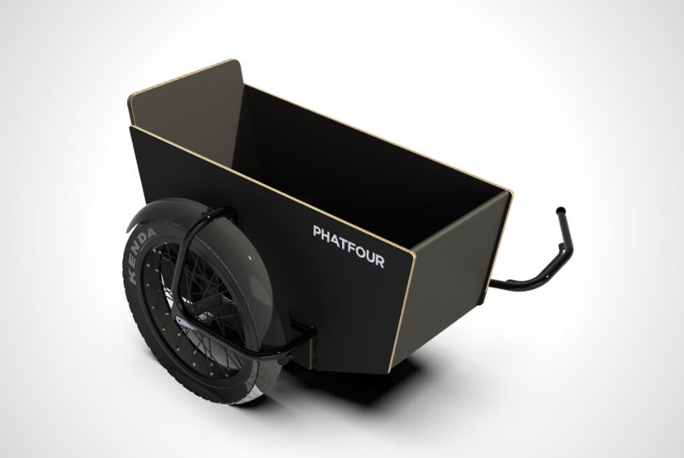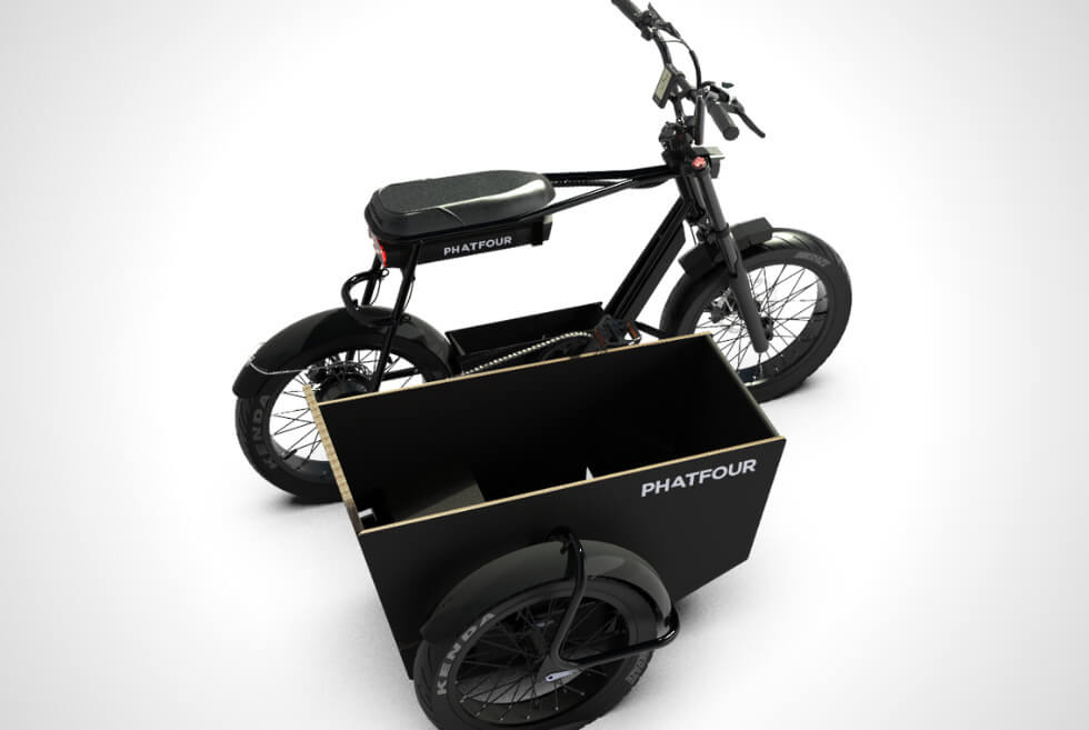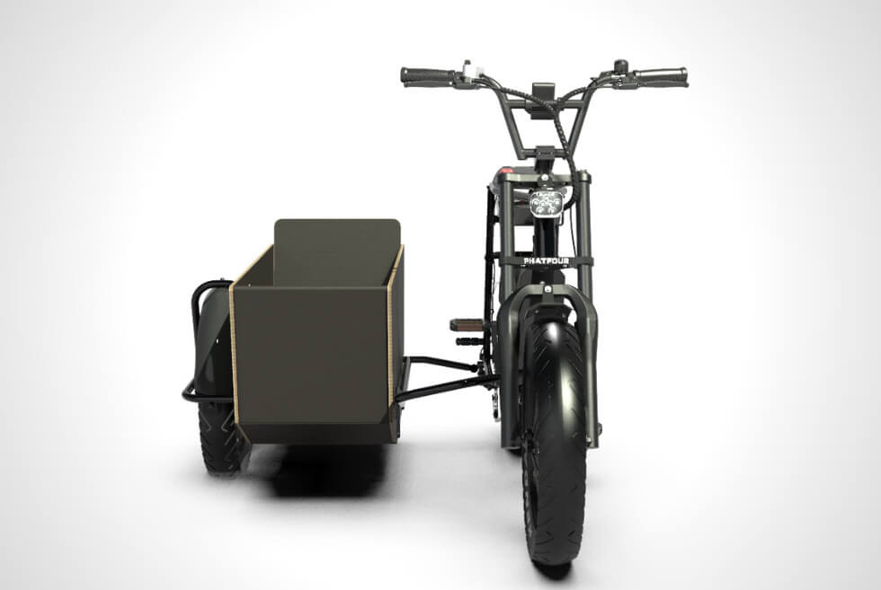 It attaches to your FLS or FLB e-bike through proprietary a connecting arm. The frame is powder-coated steel in black and sits des on a 20-inch wheel with a Kenda fat tire. The Sidecar can be yours for $1,035. Order it directly from Phatfour and enjoy the versatility it gives your ride.