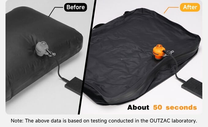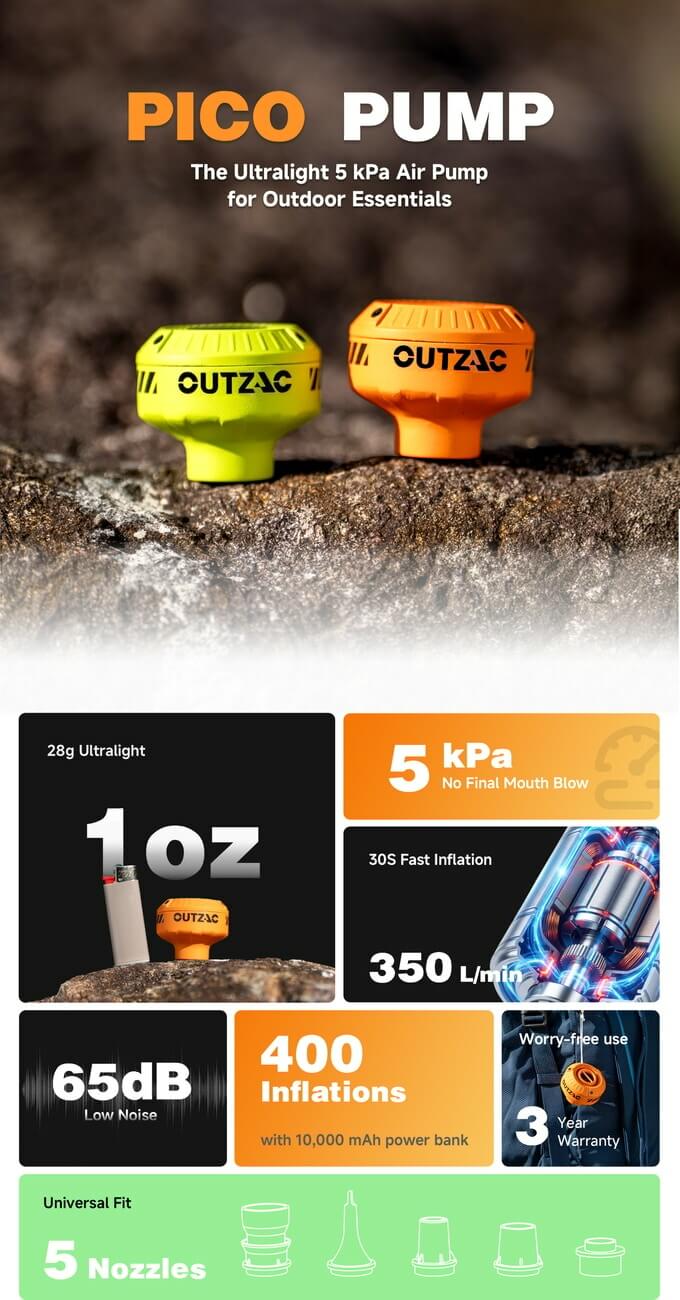 Pico Pump can inflate a sleeping pad in just 30 seconds and the high pressure brings the pad to its full firmness sans any manual top-off. Moreover, it can handle home air mattresses, beach inflatables, kayak, and more. It’s also compatible with vacuum compression bags, removing air in about 50 seconds, reducing storage volume by around 90%. It also helps start a fire and comes with five interchangeable nozzles and a built-in nozzle for direct use.