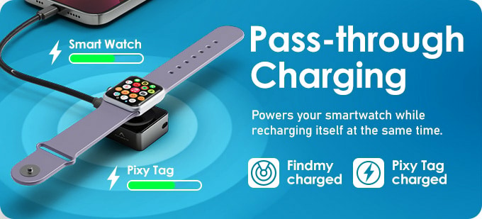 Moreover, the Pixy Tag has USB-C pass through capability, which allows for dual-charging. It can power both the device itself and your Apple Watch when connected to a USB-C power source. This also recharges the integrated Find My battery, which spans an impressive two years.