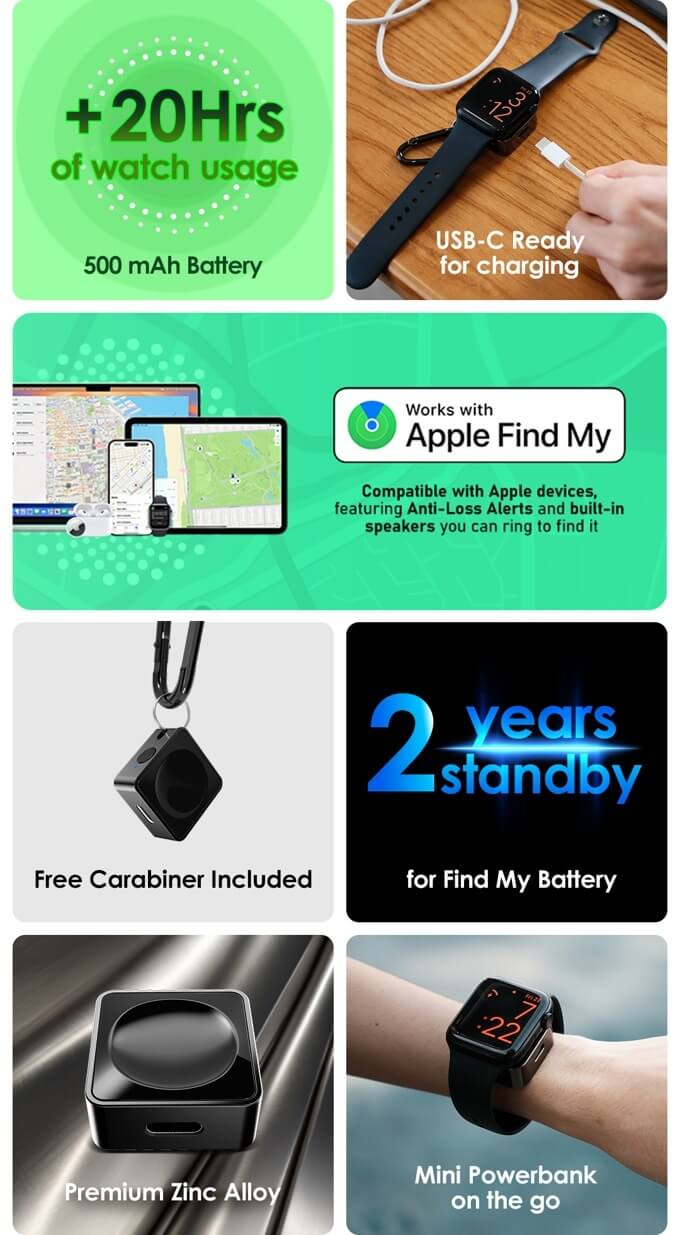 It integrates all these features into a cable-free and lightweight design at just 30g. Simply snap on top to give your Apple Watch up to 20 hours of additional life from its built-in rechargeable 500mAh battery. It also delivers a full 5W fast charge for quicker top-ups unlike Apple’s standard 2.5W puck.