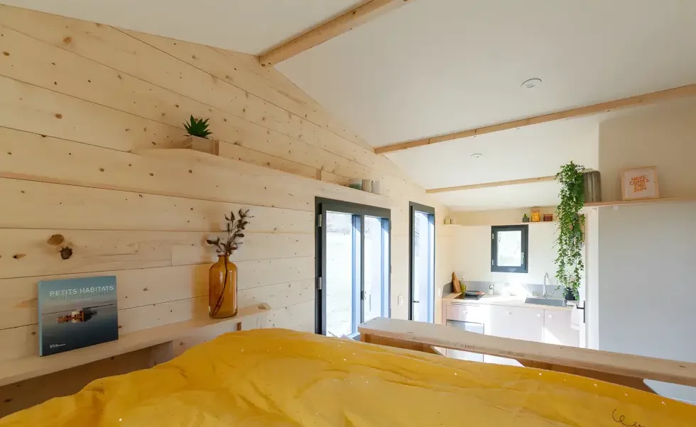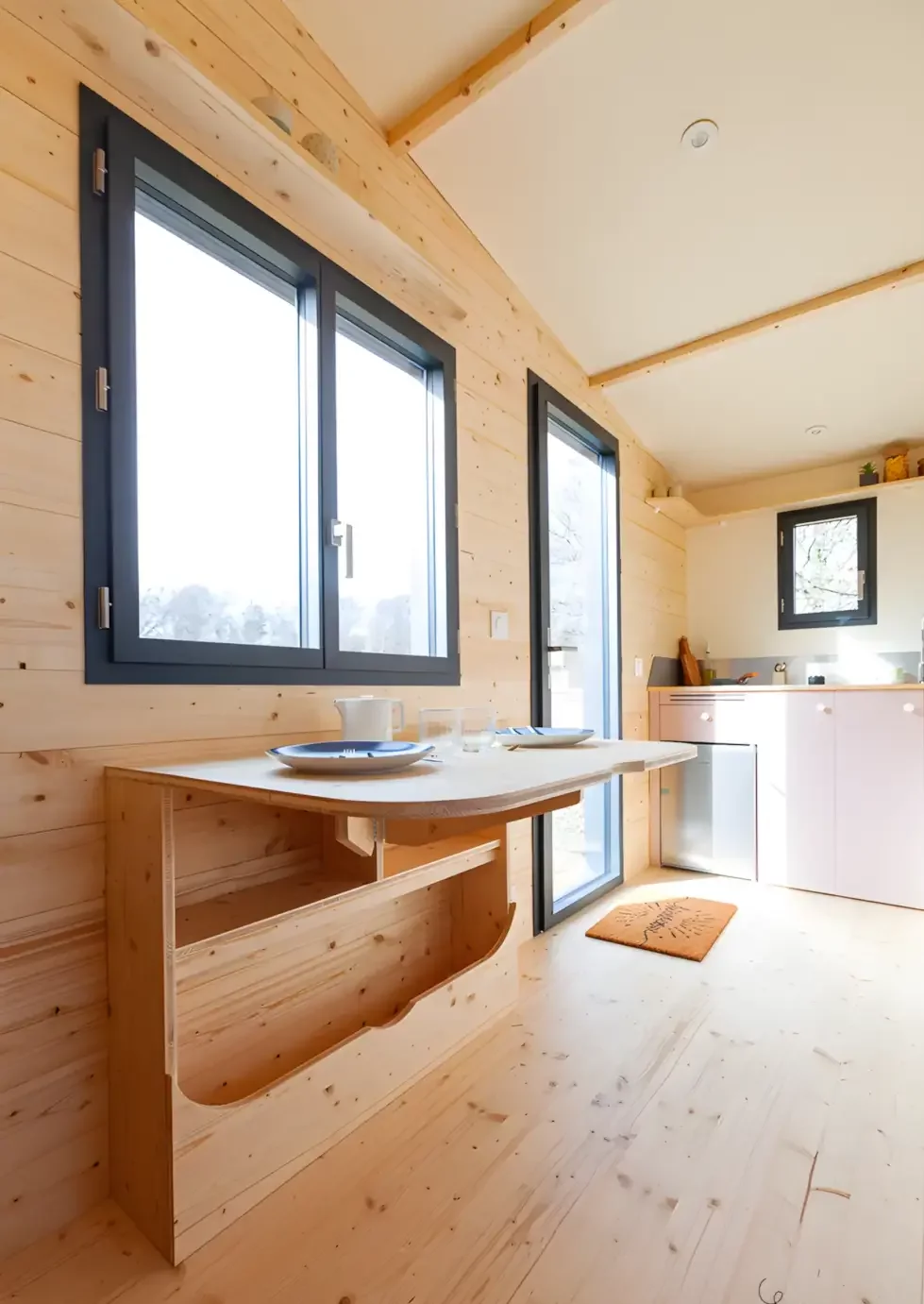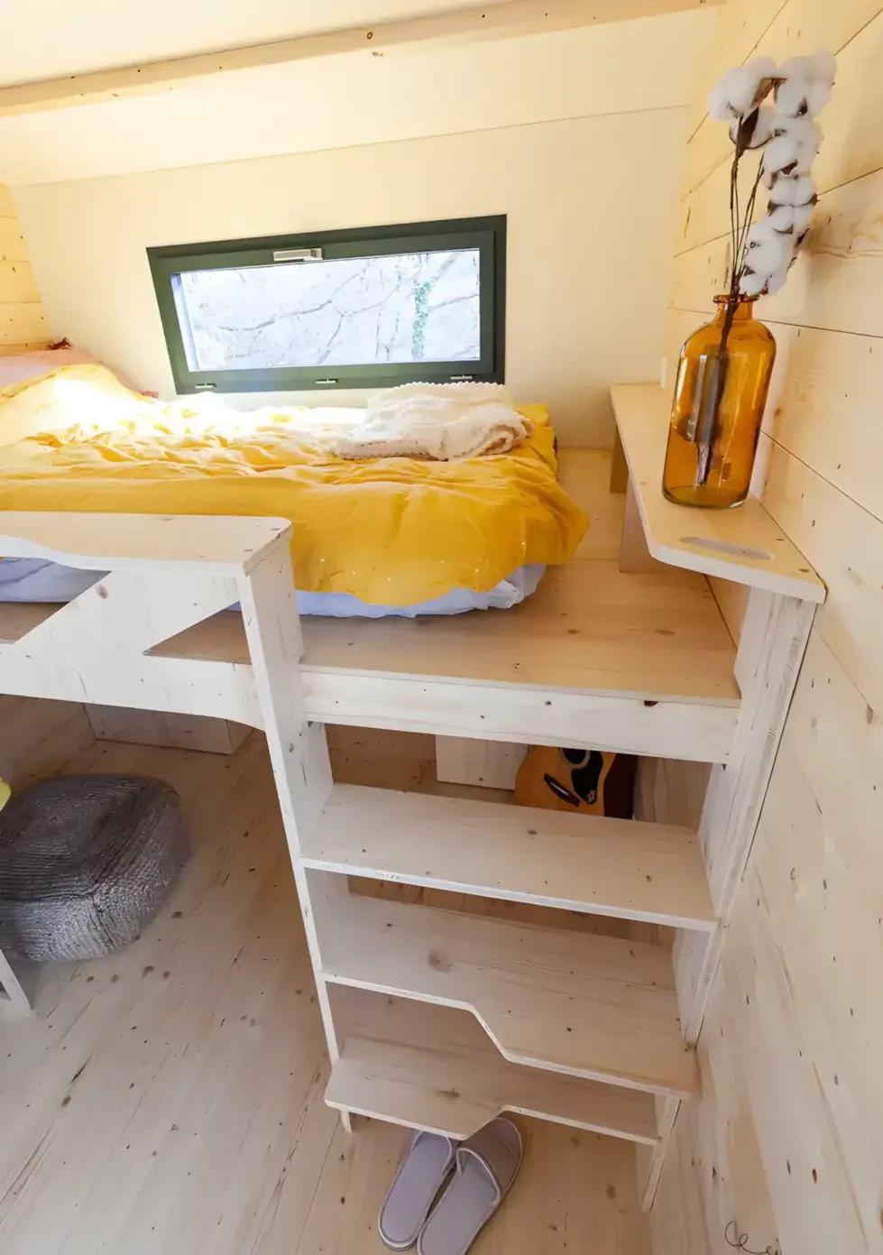 As for the bathroom, it’s the only separate room in Tiny house du Lac. It’s small but Plume was able to equip it with a shower, a sink, a flushing toilet, and some shelving. This house is made to be easily towable to abide by the strict towing laws in France. It serves as a rental or vacation house.
