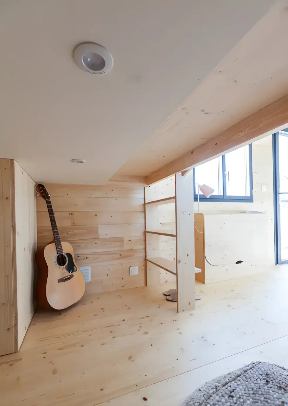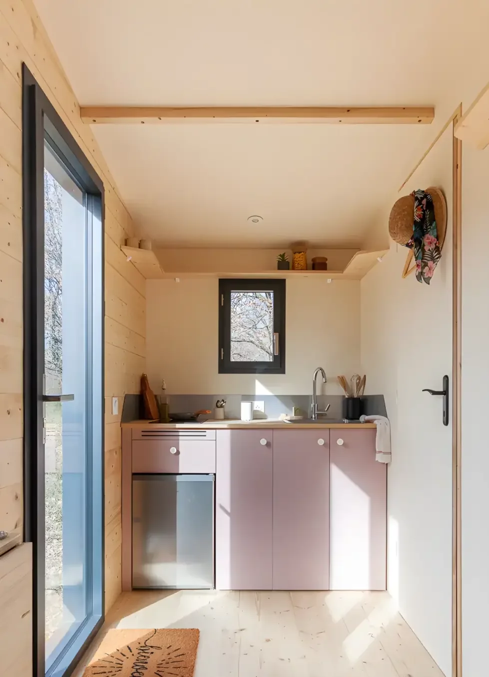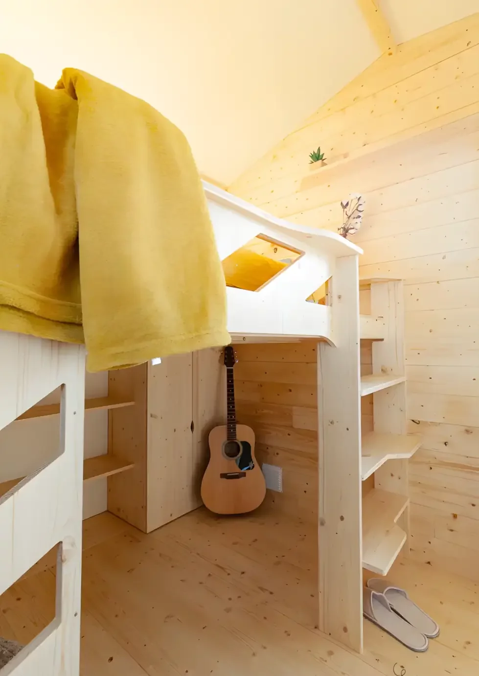 As for the bathroom, it’s the only separate room in Tiny house du Lac. It’s small but Plume was able to equip it with a shower, a sink, a flushing toilet, and some shelving. This house is made to be easily towable to abide by the strict towing laws in France. It serves as a rental or vacation house.