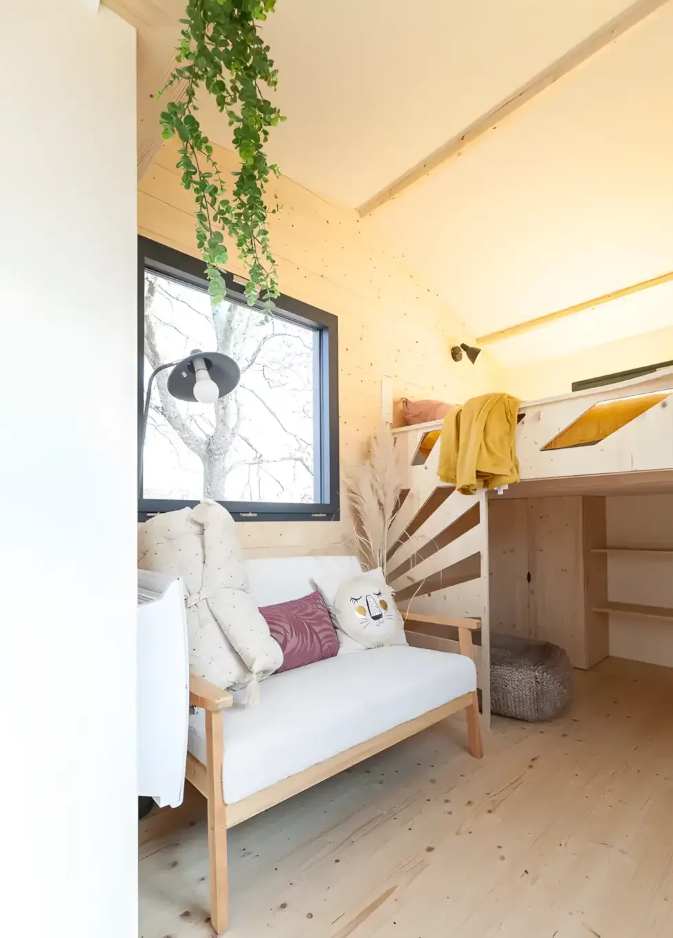 While the kitchen is compact, it still has space to cook, wash, and clean. It offers an induction stove, a small fridge, a sink, and some custom cabinetry for storage. Despite the limited space, the Tiny house du Lac, which translates as Tiny house at the Lake, managed to include a living room, which has a two-person sofa and a small drop-down wall-mounted dining table for two.