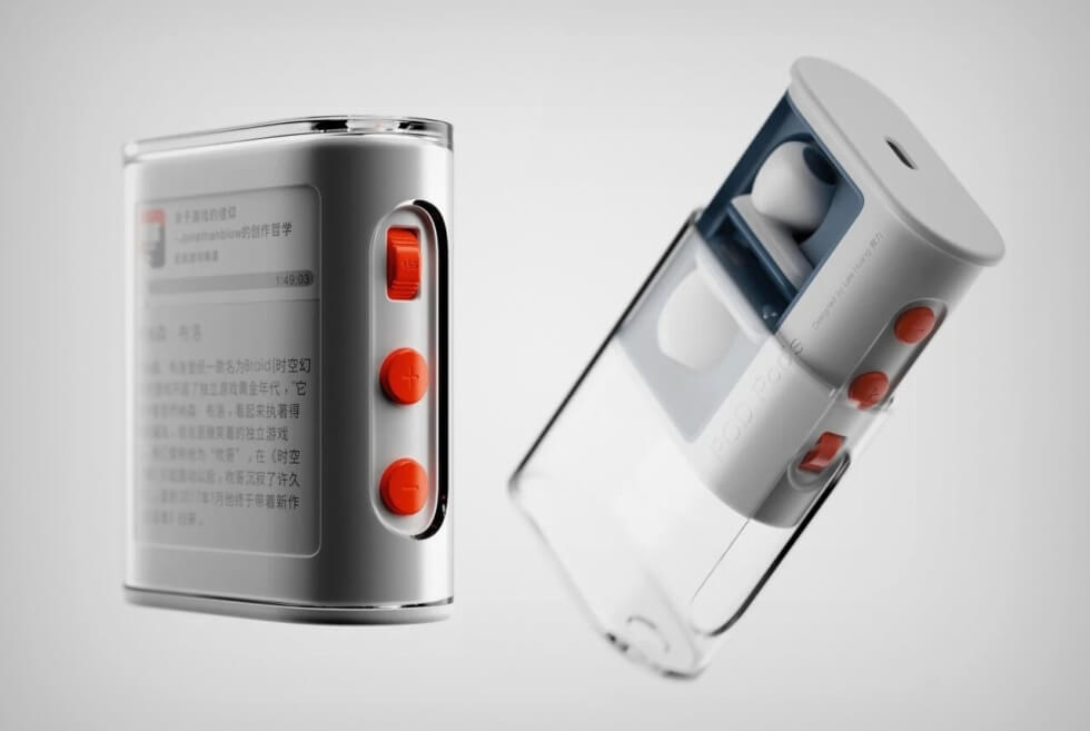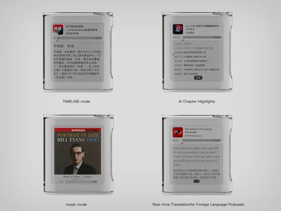 Another fascinating feature of the POD Pods is the color electronic ink display mounted on the rear. During music playback, the screen shows the album cover and track information. For podcasts, users can toggle real-time translations, AI chapter highlights, in addition to the standard Timeline mode. There’s even a charging dock/speaker accessory with integrated controls.