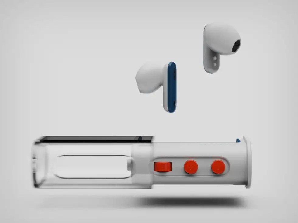 It may look like your average pair of TWS earbuds, but the renders tell us more. The charging case comes with a transparent slide-to-open cover. However, cutouts provide access to volume buttons and a proprietary Timeline Wheel. A hold switch on top is likewise available to prevent accidental presses.