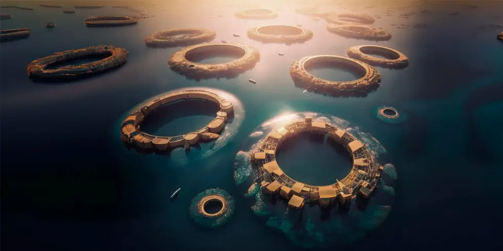 On-site floating factories begin with gathering, crushing, and compacting waste plastics. These then form the buoyant foundation for clusters of ringed cities. Once completed, the Polimeropolis runs on clean energy from tidal movements while potable water comes from reverse osmosis procedures. Food production follows via marine farms within their enclosed sections.