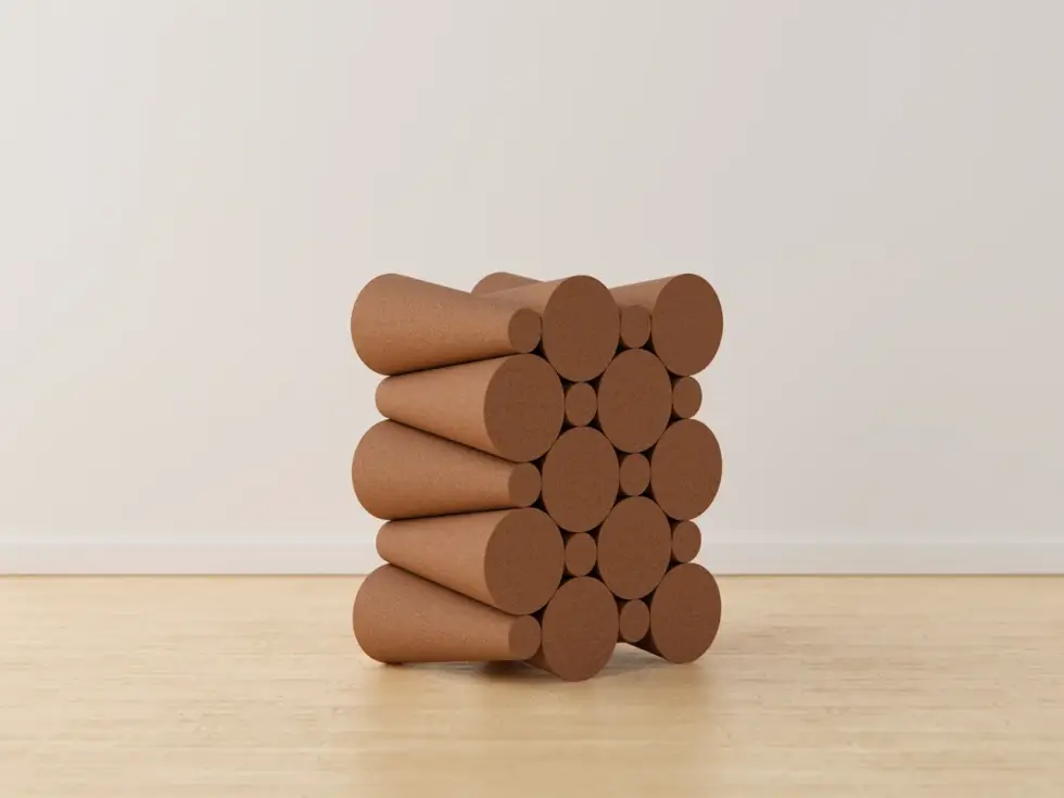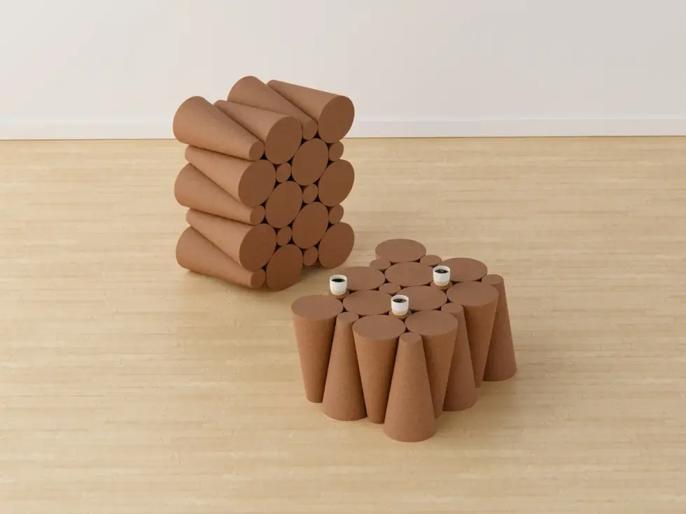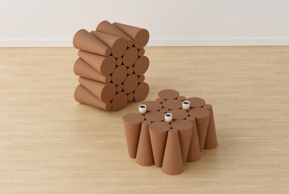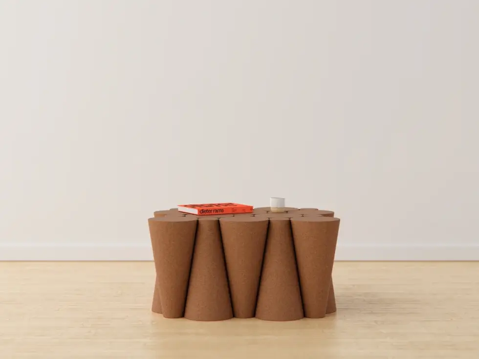 Cork offers great resistance to heat and scratches as such there are already coasters made from cork sold in the market. In his design, de la Bedoyere shaped the table using inverted cork cones that serve as built-in coasters. They measure approximately 90–100mm in diameter at the top, perfectly sized to support a cup. Then the cork cones are wide at the base for stability.