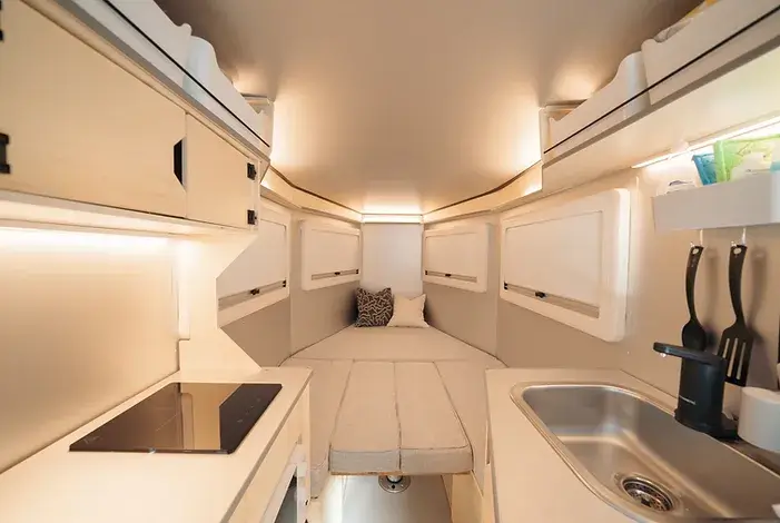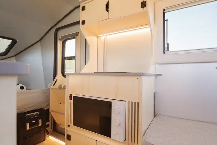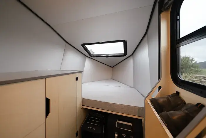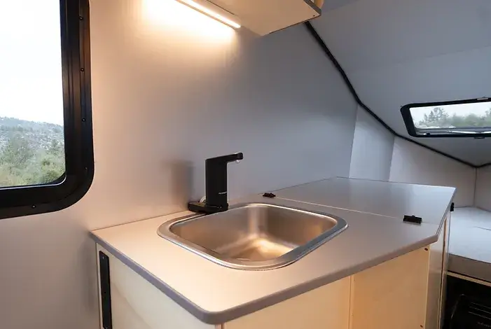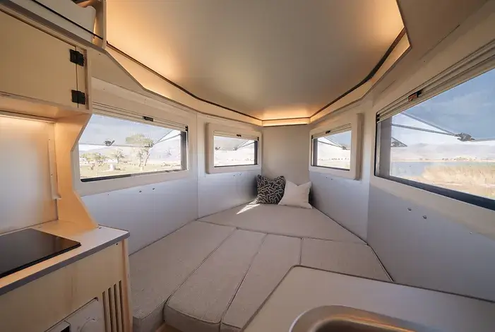 Meanwhile, the front wedge doubles as a storage deck or as area for the kids’ bed. The Polydrops P21 offers customization to fit your off road essentials. A kitchen equipped with a refrigerator can be added, as well as a convertible shower and Porta Potti.