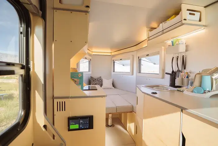 This addition, along with the fitted Timbren independent suspension system, makes the Polydrops P21 incredibly aerodynamic. It easily cuts through the air making it less of a towing burden. Subsequently, also improving gas mileage or EV range and minimizes the need for a recharge.