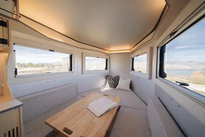 As for its interior, it boasts six feet of stand-able height and lengthy enough to accommodate modern amenities at 21 feet. Expansive windows bring in natural lighting while finishes come in warm tones to make the interior feel cozy. The main sleeping accommodation comes in the form of a queen-sized bed in the rear. This area is also convertible into a lounge or working space.