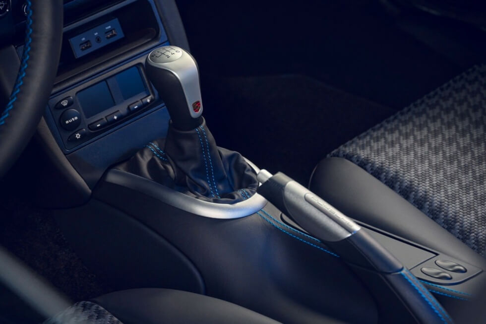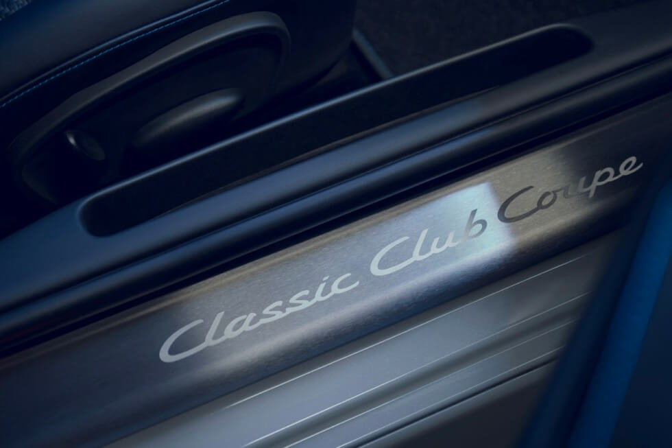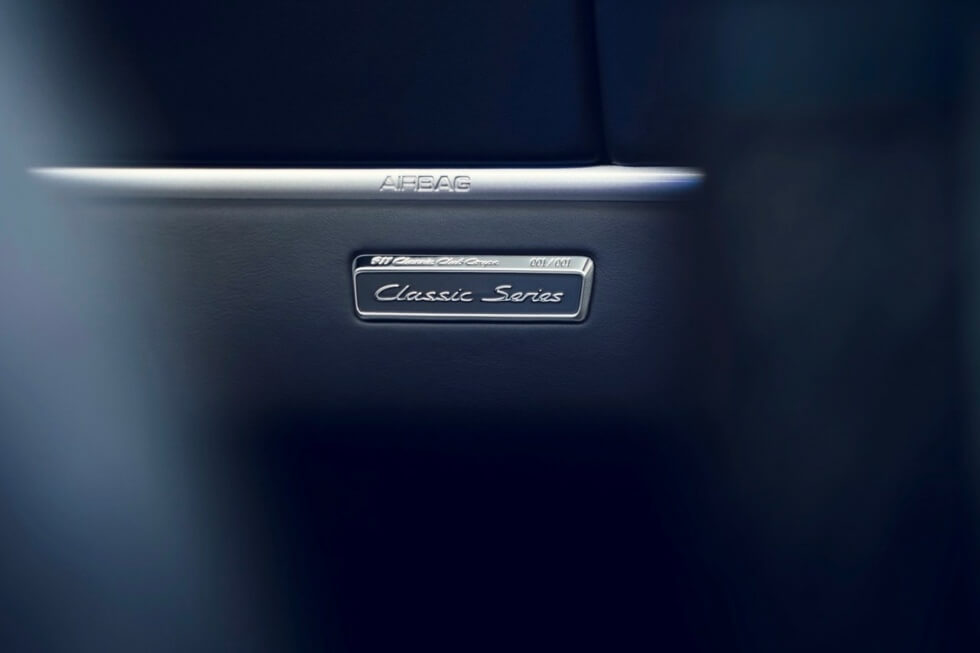 The 911 Classic Club Coupe’s designation as a one of one model is indicated on a special plaque you can find on the exterior and interior. The cabin features black leather upholstery with Slate Gray accents and blue stitching all around. It also boasts a perforated Alcantara headliner, while the headrests have embroidery of the model’s name in blue.