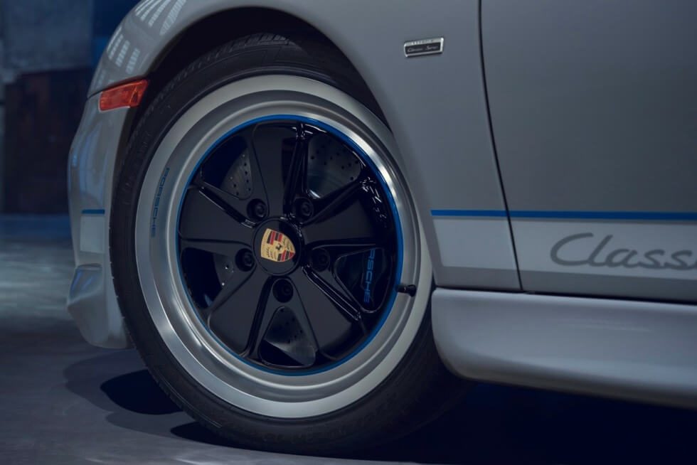 It flaunts a Sport Gray colorway with white racing stripes and blue trims. Graphics on the sides indicate the name of the 911 Classic Club Coupe. It appears the original powertrain remains intact with a 3.6-liter flat-six that outputs 381 horsepower.
