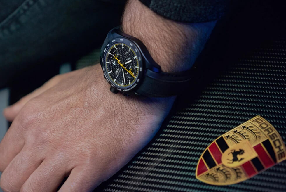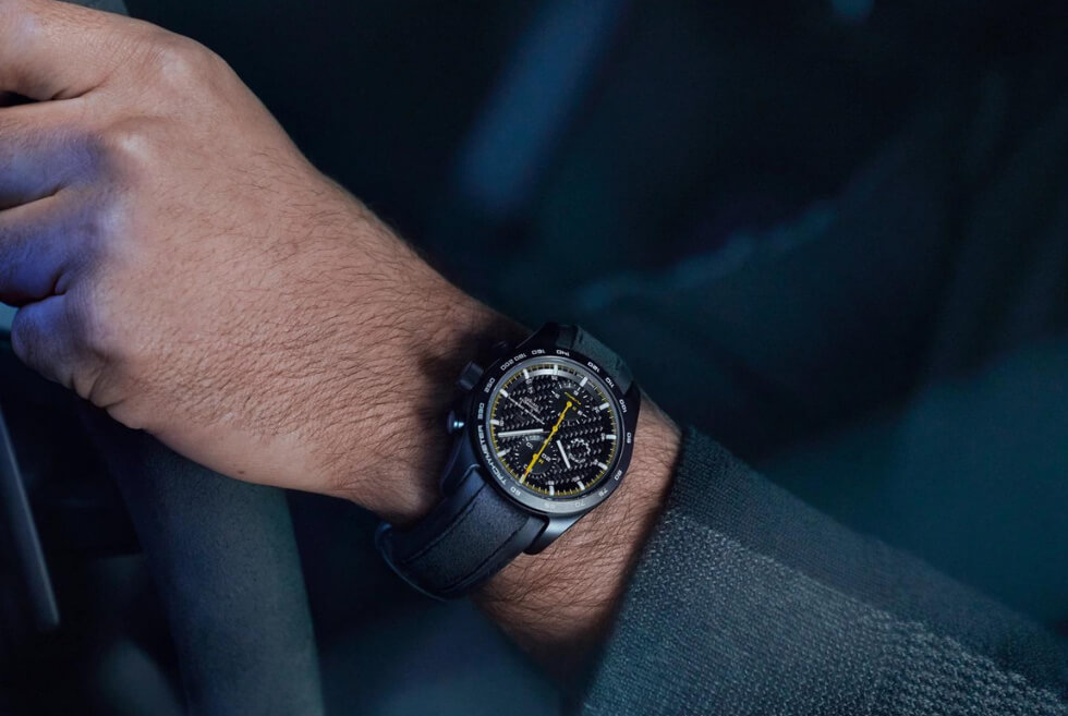 The watch clearly goes for a motorsport-inspired motif, but before we get into that, here are some of its specifications. Porsche Design goes for a 42-mm titanium case with two color options. You can get it in the natural shade of the metal or with a black titanium carbide coat.