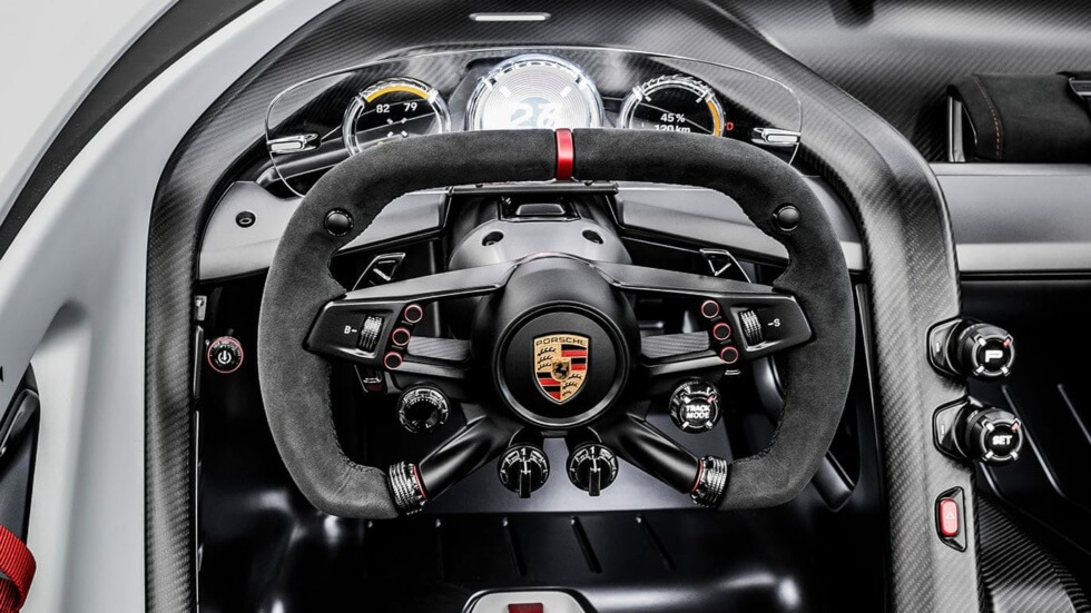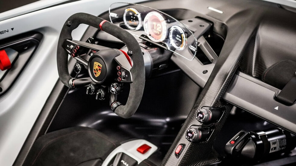 “We spent a long time considering the right material design consisting of carbon and titanium. The aim was to reduce weight while increasing performance,” says the Head of Interior Design at Porsche Markus Auerbach. “In addition, sustainable aspects also play a role in forward-looking projects. For example, we only used entirely vegan materials in the concept car.”