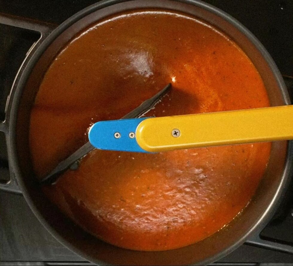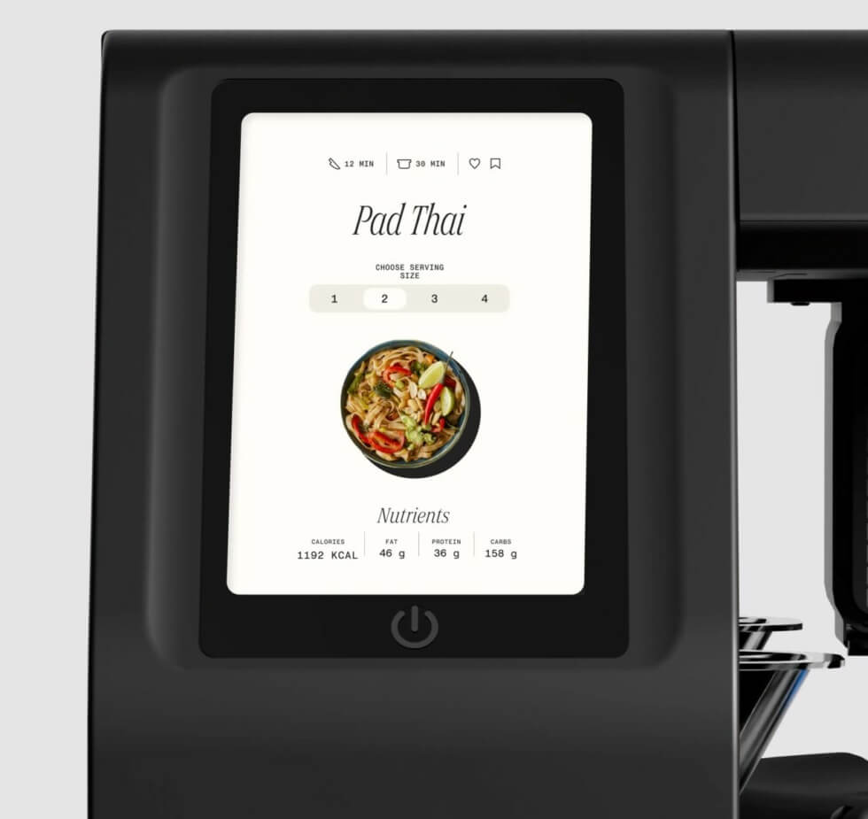 On its interface is a touchscreen menu showing various recipes, automatic ingredient dispensers, refillable spice pods, and oil and water containers. Moreover, the Posha kitchen robot has a large detachable pan with modular stirrer and spatula attachments.