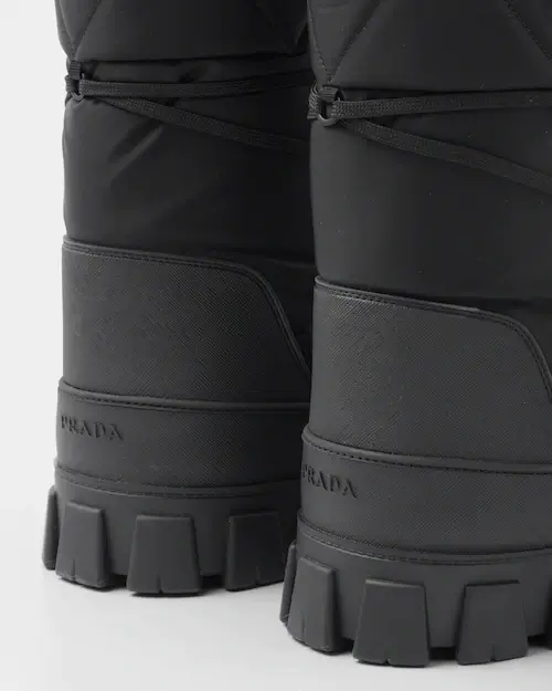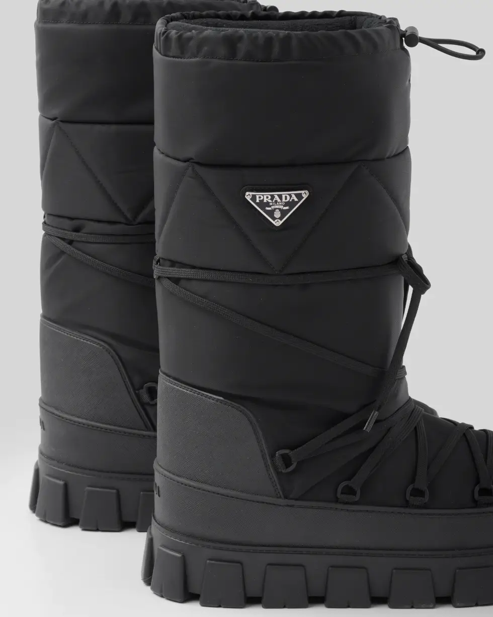 Prada’s Gabardine Après Ski Boots feature a sports-meet-technical design with a fabric/leather construction and an all-black color theme inside and out, save for the iconic enameled metal triangle Prada logo. This shoe is made with nylon and has a removable padded pile lining to keep those soles comfy and warm. The upper drawstrings help to seal the heat in and add extra security on top of the tubular lacing closure to ensure the shoes stay snug.