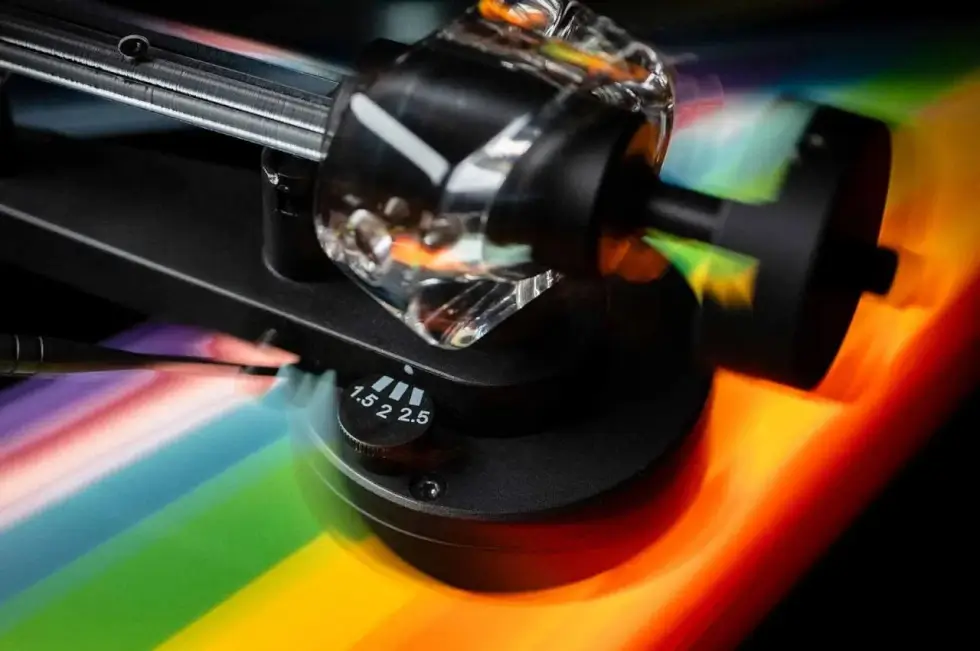 A metal component sticks out to the left of the delta-shaped base, while the tonearm is mounted to an LED-backlit rainbow on the right. The manufacturer confirms the illumination is dimmable. The tonearm is acrylic with black aluminum hardware and a Pick it PRO Special Edition cartridge to matche the theme of The Dark Side of the Moon Special Edition turntable.