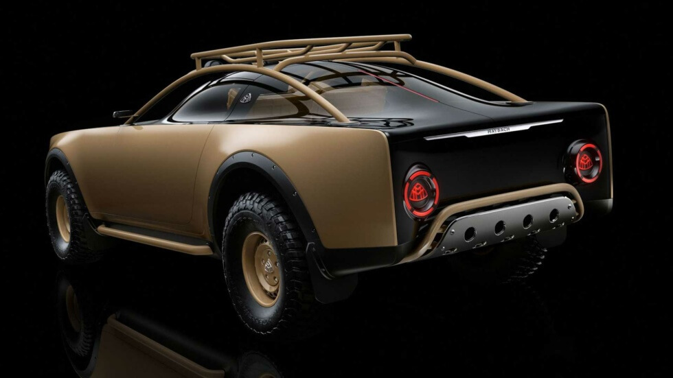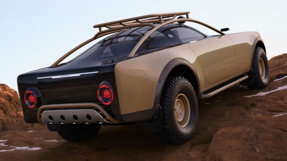 The elongated hood of the Project Maybach houses solar panels underneath a transparent overlay. This gives the exterior a classy two-tone colorway of tan and black. The front fascia manages to capture the signature look of the luxury marque. Meanwhile, the bull bar and roof rack feature additional lighting, which makes it look ready for a safari.