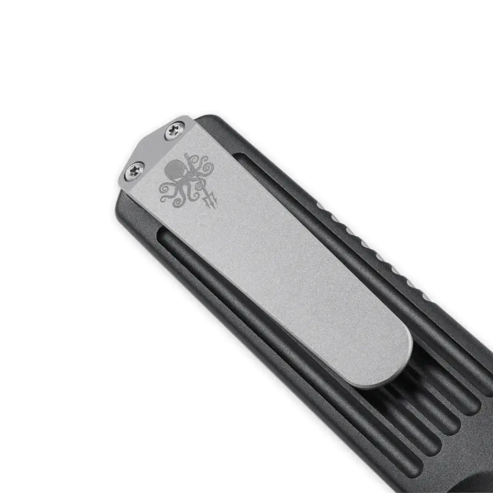 As such, it has fine details machined through including a blade fuller, signature handle fillers, titanium billet pocket clip, and jimping for saber. It also has reverse grips and an internal lanyard pin. Likewise, it has fully machined-contoured, T6061 handles with a type III hard-anodized finish.