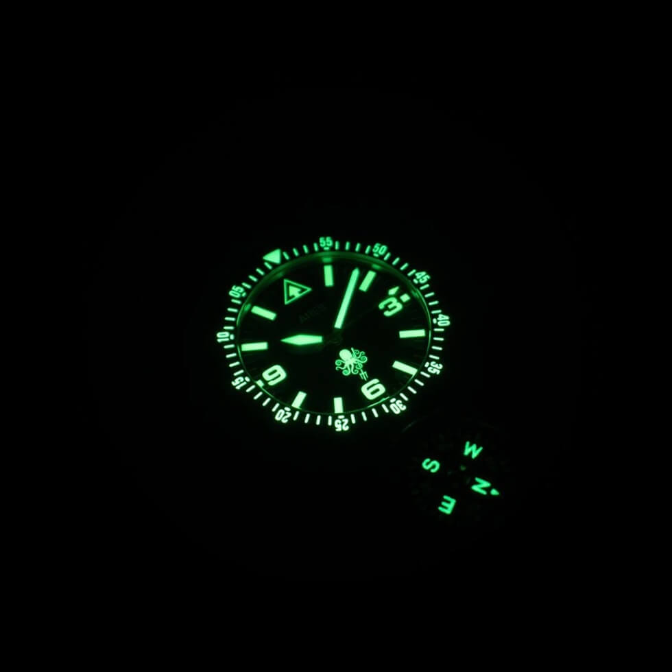 A black Cerakote stainless steel bezel frames a brass dial in black. Super-LumiNova coating is applied to all its indices to keep them visible even in the dark. The co-branding shows the ARES Watch Co. emblem at 12 o’clock, while Prometheus Design Werx’s Special Projects Division’s logo appears just above the 6 o’clock hour marker.
