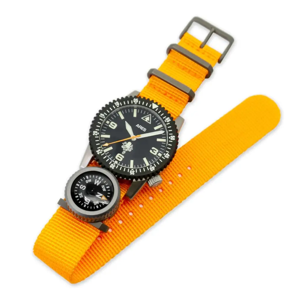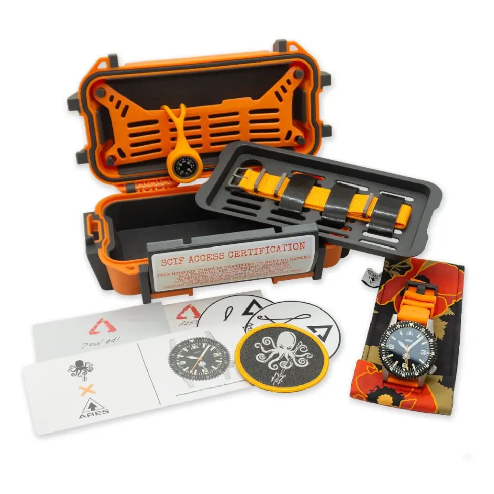 The three-hand complication is managed by a Swiss ETA 2824 self-winding movement. The 25-jewel automatic caliber is quite reliable and provides a 38-hour power reserve. Prometheus Design Werx pairs it with a vibrant orange Ti-Ring NATO strap to round out its rugged profile. Each SPD x Ares Diver-1 Mission ships with a Compas Kit 2.0, a spare strap, an SPD Morale patch, ARES sticker patch, and a co-branded waterproof Pelican hardcase.