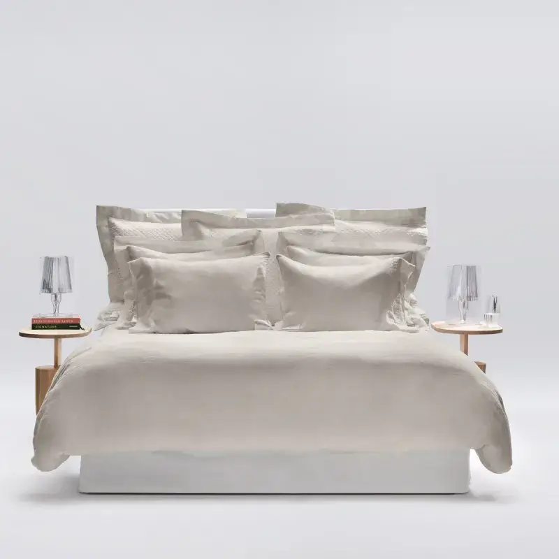 Lastly, the Beach House Linen is made from the finest 100% European flax for ultimate breathability and optimal airflow.  Coated with NordShield Crisp for a comfortable sensation for those who like to sleep warm. The PROSSIONI label, french seams, and mitered corners give the collection a luxurious feel. They also come in various sizes from small sheet sets with one standard pillowcase and fitted sheet to European sets complete with a fitted sheet, a sham, and a duvet cover.