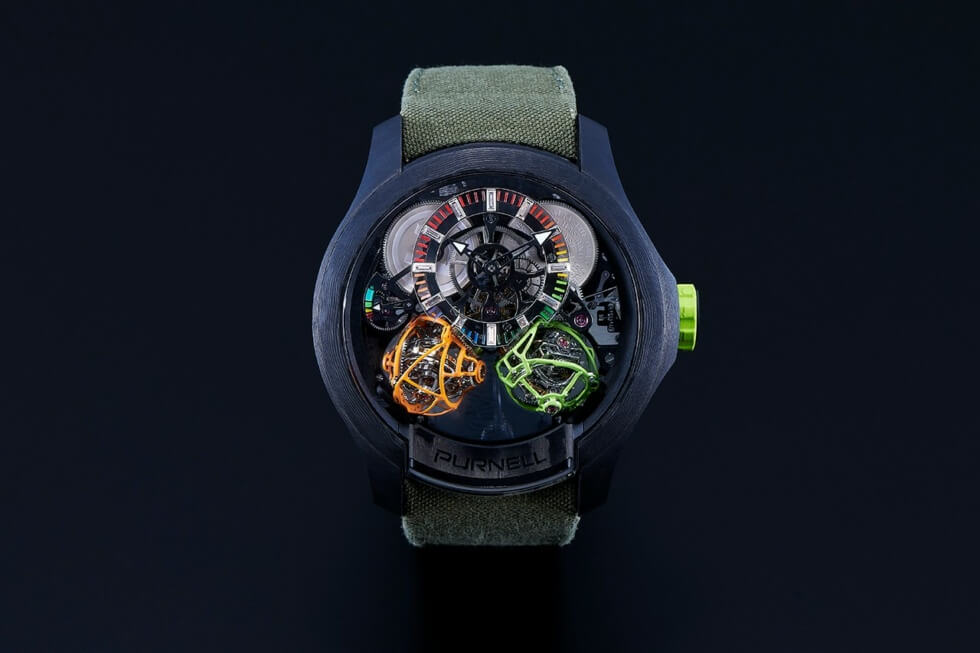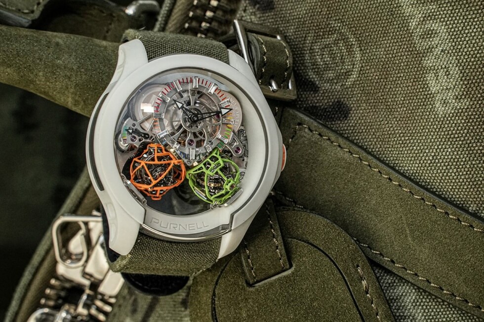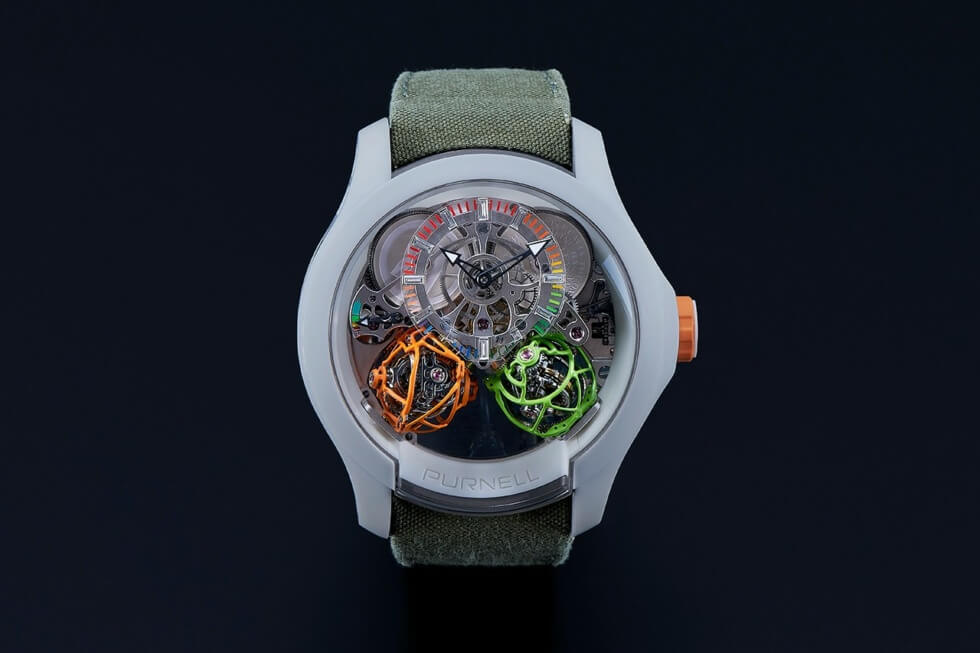 Its power reserve indicator likewise flaunts a vibrant palette. Purnell adorns the Escape II with baguette-cut diamond for the hour markers. Finally, the watches ship with an upcycled genuine U.S. military WWII fabric strap from READYMADE.