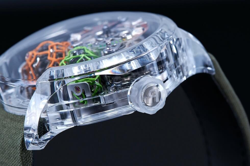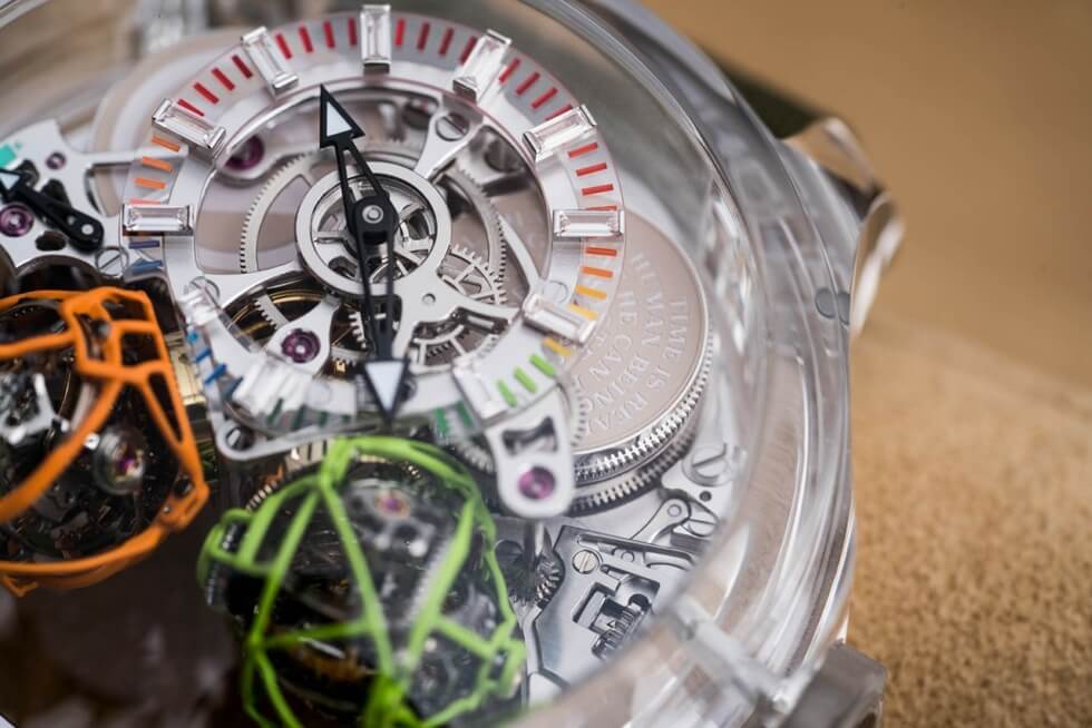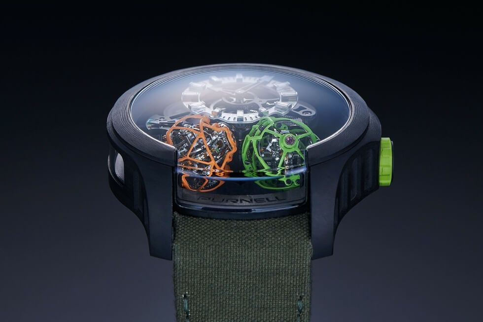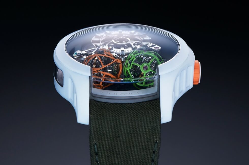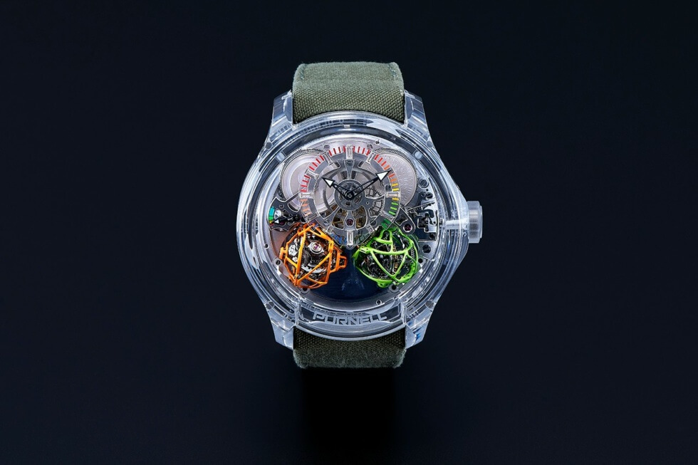 The movement boasts a 32-hour power reserve and two Spherion triple-axis tourbillons in neon orange and neon green. The transparent caseband and caseback allow owners to enjoy the intricate dance of all 386 components from various angles.