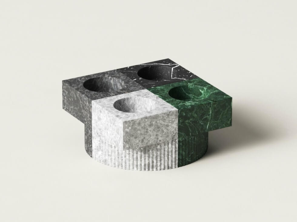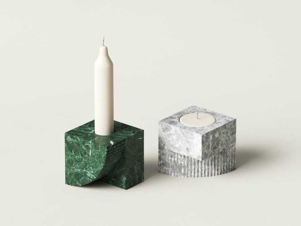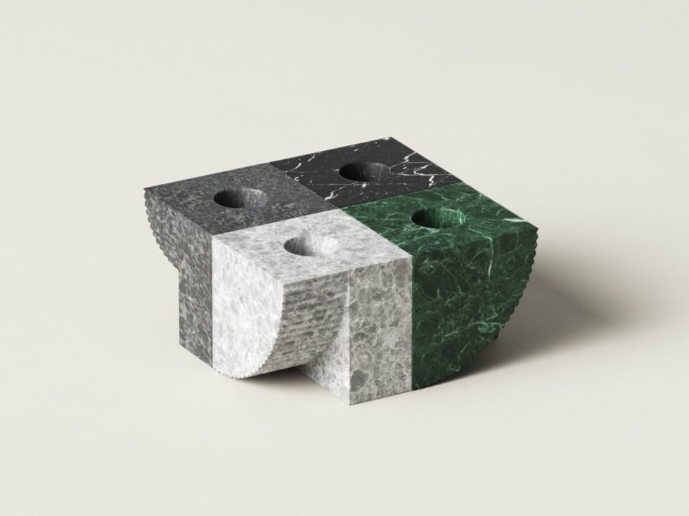 This candlestick boasts a modern and unique silhouette thanks to its materiality. It features different variations of marble and granite in varying hues from deep green marble to soft gray granite. Its ribbed quarter cylinder breaks the visual heaviness and gives the design a modular quality. You can stack several pieces together with the ribbed quarter cylinders joined together to form a small table of candles. You can arrange them in grids or mix different stone colors for a colorful contrast.