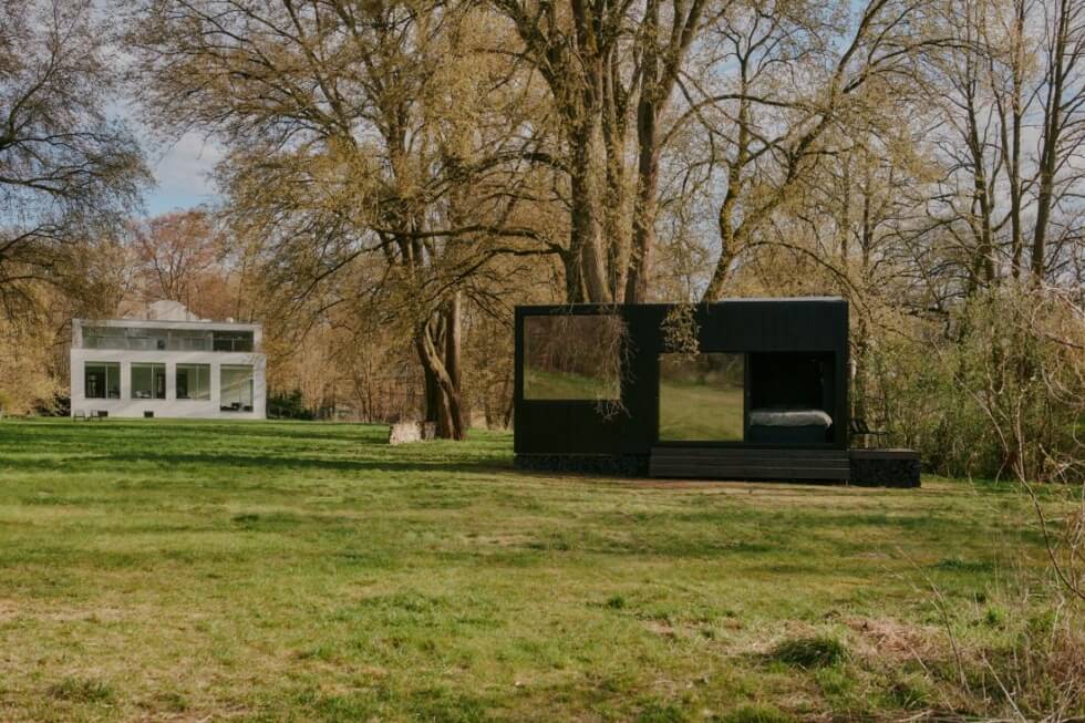 Guests have access to a small kitchen counter with a sink, drawers, and a two-burner stove. RAUS will likely provide kitchenware such as pots, pans, utensils, and more for convenience. Inside, there’s a queen-size bed, bunk beds, a seating area, and a bathroom. The exterior and interior are clad in black-stained wood.