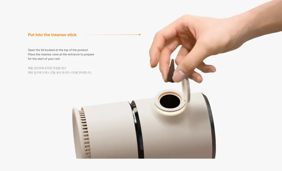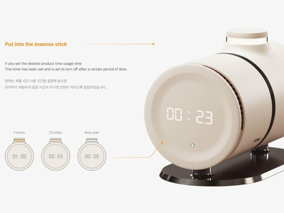 Inspired by the concept of sunrise and sunset, it gradually descends when in use. It has a dedicated spot to insert an incense stick and when powered on, the mood light also turns on as the incense slowly burns and emits its fragrance via vent holes.