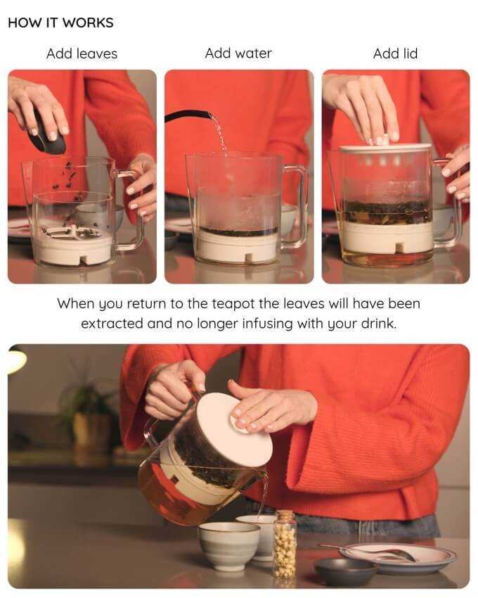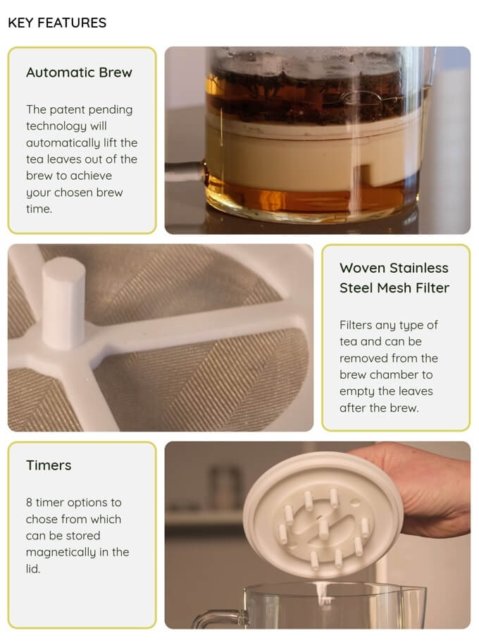 The design focuses on functional sustainability and combines simplicity with technology with the aim of preventing over or underbrewed tea. Its patent-pending mechanism foregoes the use of any electronic parts in the automation to ensure the product’s recyclability.