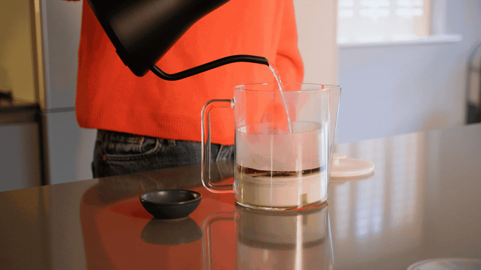 It brews according to the number of pegs chosen. But without a peg used it only takes 30 seconds to brew. The automation happens alongside the water flow. As water seeps through the filter to immerse the tea leaves and then through the holes, it slowly fills the carafe with the brewed tea.