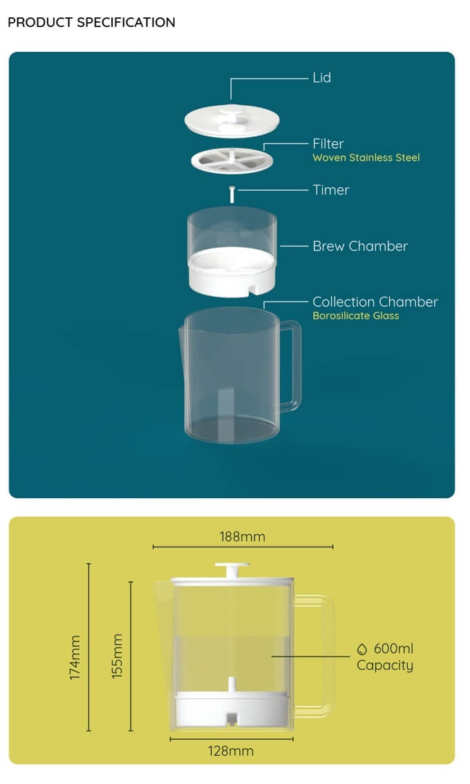 Meanwhile, the collection chamber/carafe is borosilicate glass and the brew chamber from extruded PMMA (Polymethyl Methacrylate). The rest of the parts are PP plastic or Polypropylene, which is a versatile plastic and highly recyclable.