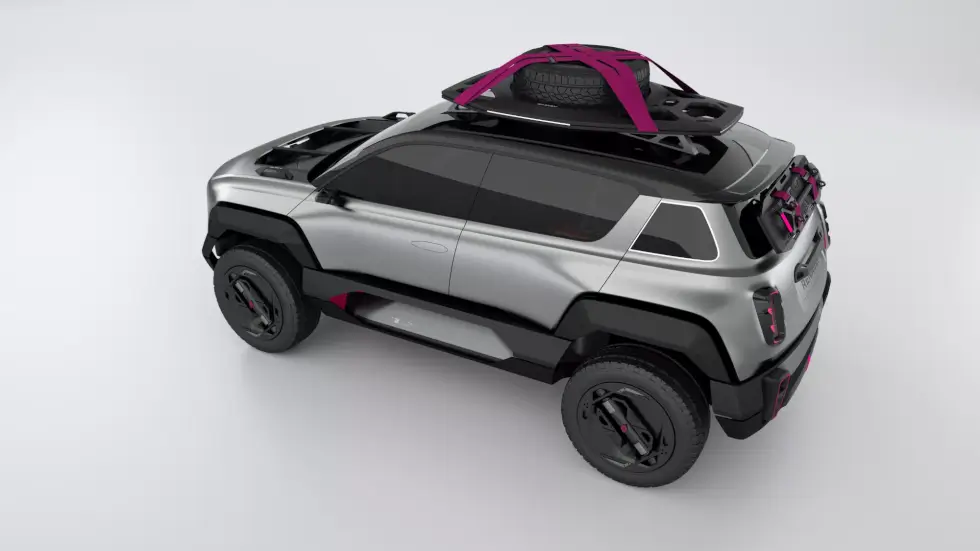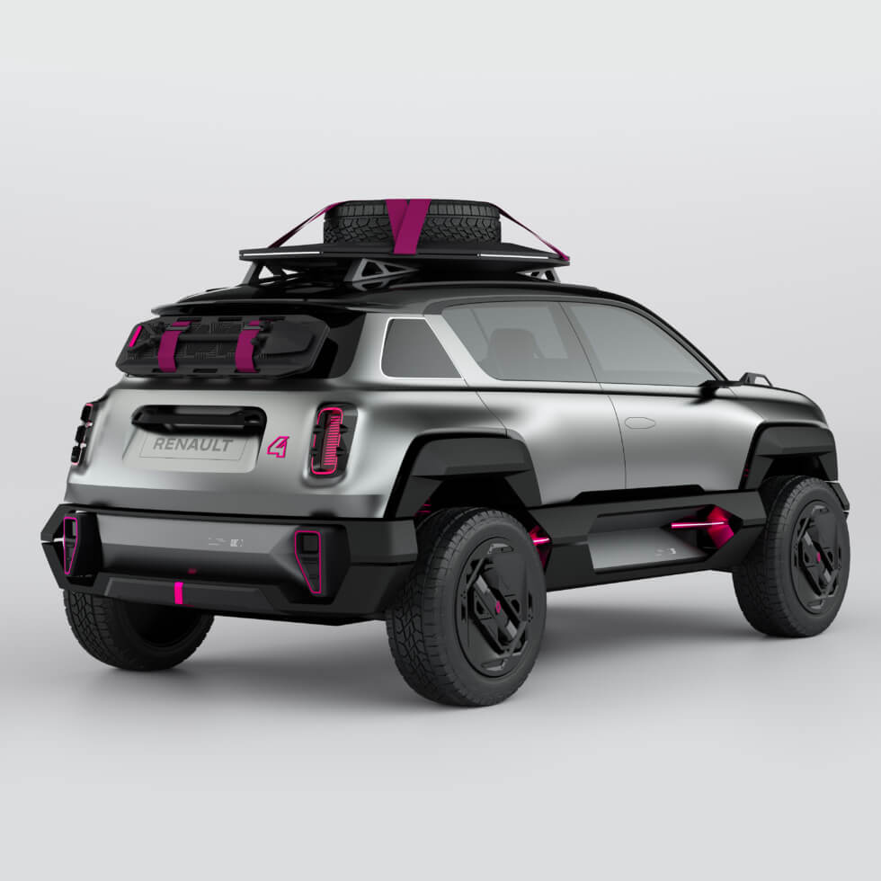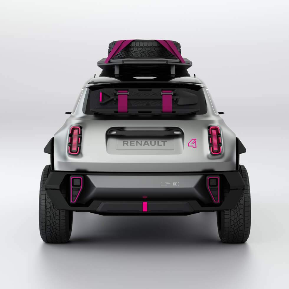 Renault stores the spare tire on the carbon fiber roof, while a rack on the rear door holds a shovel and waffle boards. The 4EVER Trophy marks the 25th anniversary of the 4L Trophy humanitarian rally.