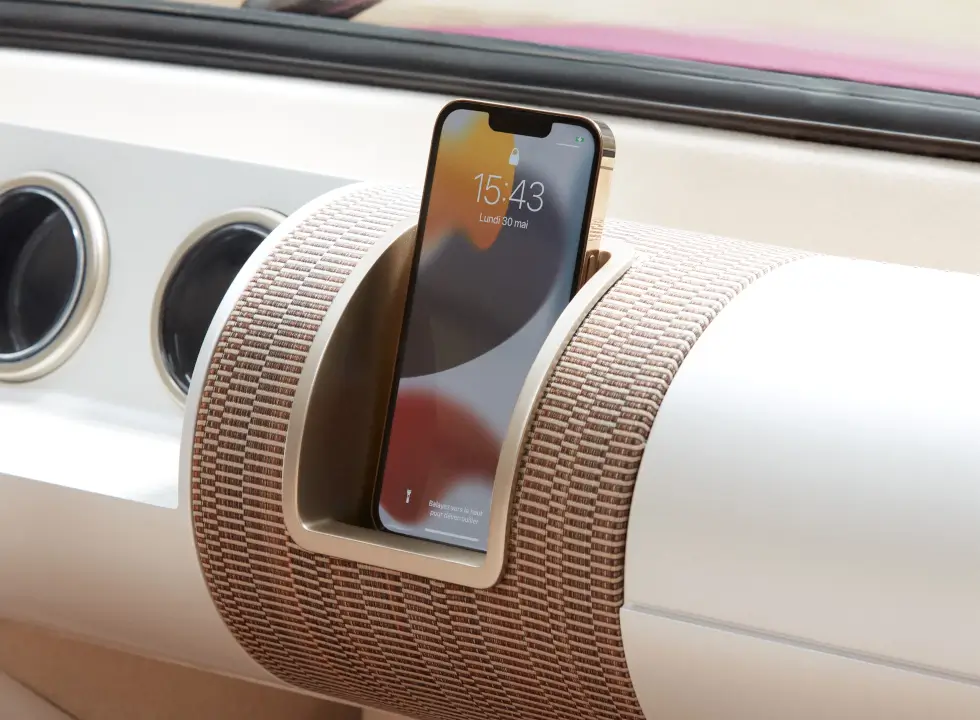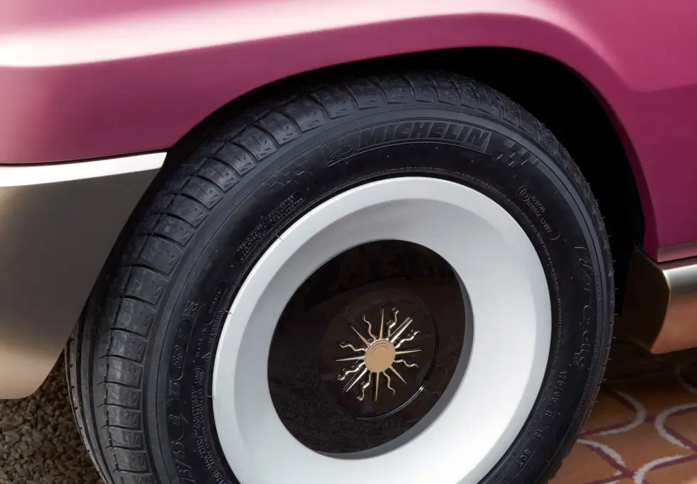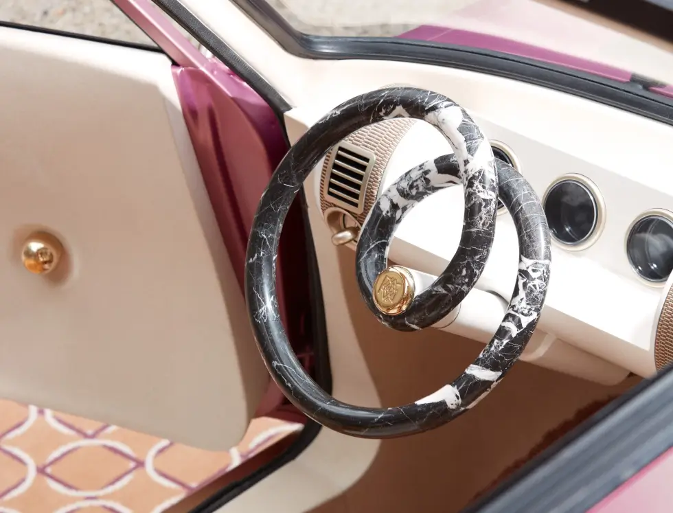 It sits on wheels sourced from the Alpine trim, but no longer shows any spokes. The rims likewise show a sun emblem in the middle against a black backdrop. The Renault 5 Diamant reveals a minimalist interior with a mix of materials like mohair wool, brass, gold, and even a spiral French marble steering wheel.